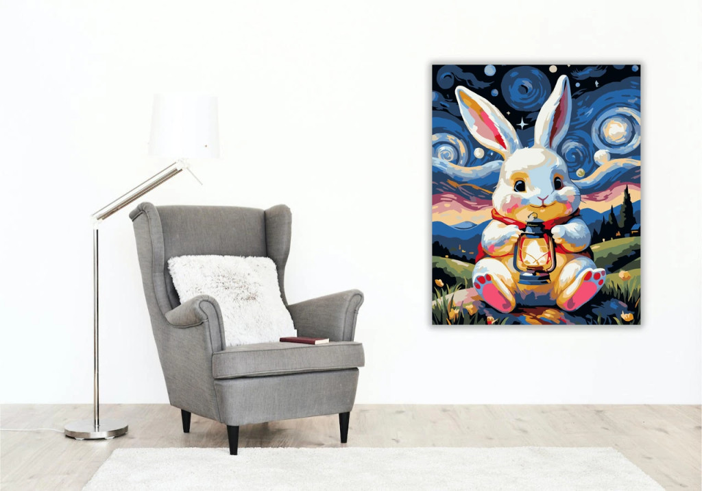 A képen egy fehér nyuszi ül a füvön, és egy lámpást tart a mancsai között. A háttérben csillagos, örvénylő éjszakai égbolt látható, távolban dombokkal és sötét fák sziluettjével. A jelenet kedves és mesés hangulatú, meleg fényekkel a nyuszi körül. Varázsolj egyedi hangulatot otthonodba ezzel a gyönyörű számfestő készlettel, amely tökéletes ajándék is lehet szeretteid számára. A csomag mindent tartalmaz, amire szükséged van ahhoz, hogy saját kezűleg alkoss egy lenyűgöző festményt.