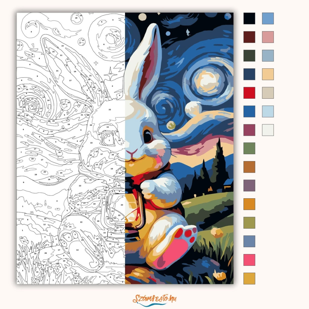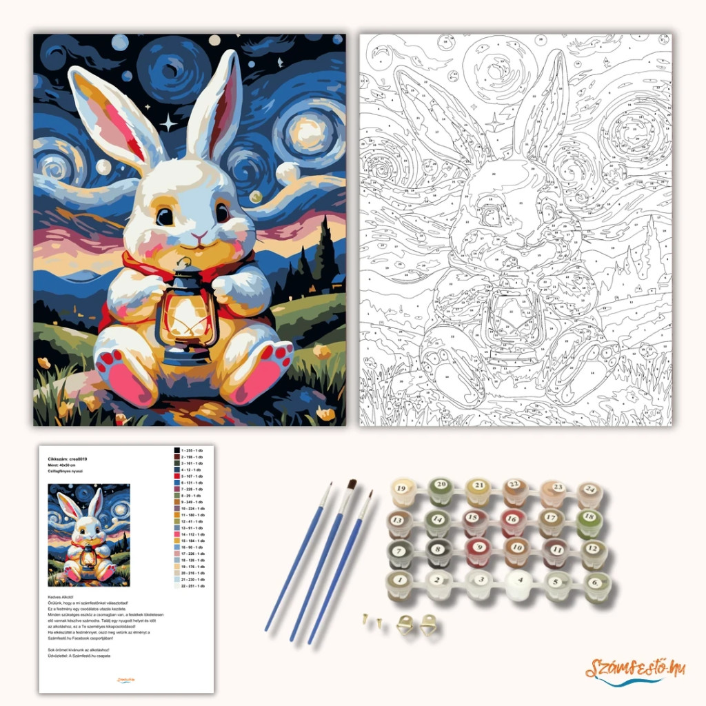 A képen egy fehér nyuszi ül a füvön, és egy lámpást tart a mancsai között. A háttérben csillagos, örvénylő éjszakai égbolt látható, távolban dombokkal és sötét fák sziluettjével. A jelenet kedves és mesés hangulatú, meleg fényekkel a nyuszi körül. Varázsolj egyedi hangulatot otthonodba ezzel a gyönyörű számfestő készlettel, amely tökéletes ajándék is lehet szeretteid számára. A csomag mindent tartalmaz, amire szükséged van ahhoz, hogy saját kezűleg alkoss egy lenyűgöző festményt.