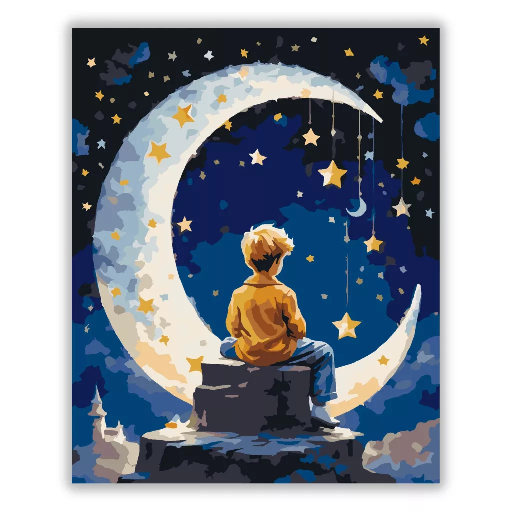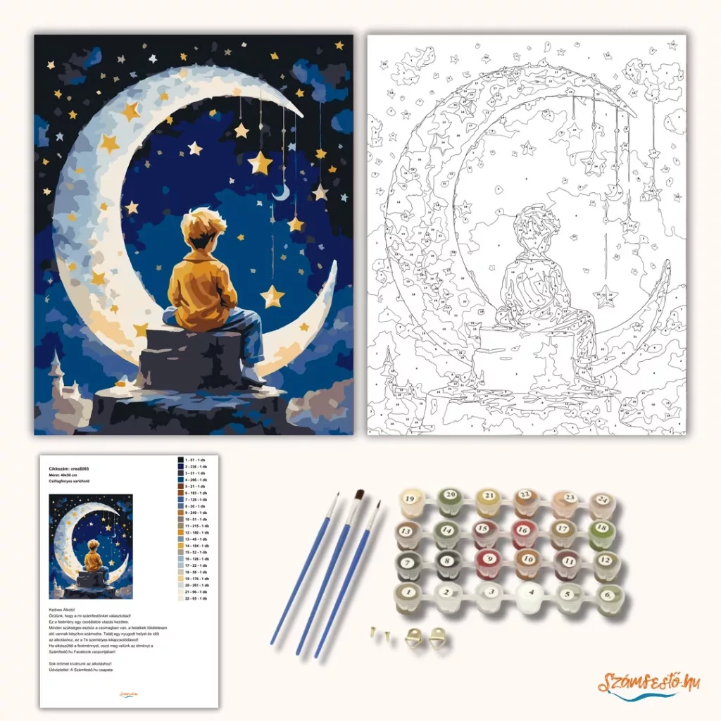 A képen egy kisfiú látható hátulról, amint egy lépcsős kőtalapzaton ül, előtte egy hatalmas sarló alakú hold. A sötét égbolton sok csillag ragyog, és több csillag lelógó díszként is megjelenik. A látvány nyugodt, álomszerű hangulatot áraszt, mély kék és világos, holdfényes árnyalatokkal. Ez a számfestő készlet tökéletes választás, ha egyedi dekorációval tennéd szebbé otthonodat, vagy ha különleges ajándékot keresel. A csomagban minden megtalálható, amire a festéshez szükséged van.