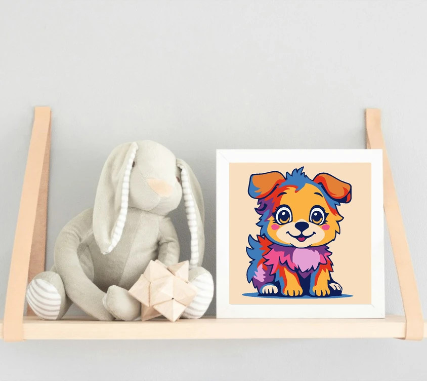 Ez a mosolygós kiskutya vidáman ül, és nagy, csillogó szemekkel néz rád. Bundája élénk szivárványszínekben ragyog: sárga, kék, piros, lila és rózsaszín foltokkal. Remek választás, ha szereted a színes, játékos állatokat! Díszítsd otthonodat saját kézzel készített műalkotással, vagy ajándékozd meg szeretteidet egy igazán különleges élménnyel! A számfestő készletben minden szükséges eszköz megtalálható a festmény elkészítéséhez.
