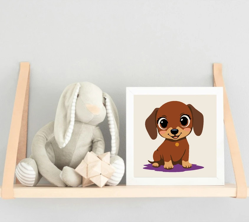 Ezen a képen egy mosolygós kiskutya ül nagy, csillogó szemekkel. Barna bundája és bézs tappancsai szépen kiemelkednek a világos háttérből, alatta lila árnyékkal. Remek választás 4-10 éves kis alkotóknak! Díszítsd otthonodat saját kézzel készített műalkotással, vagy ajándékozd meg szeretteidet egy igazán különleges élménnyel! A számfestő készletben minden szükséges eszköz megtalálható a festmény elkészítéséhez.
