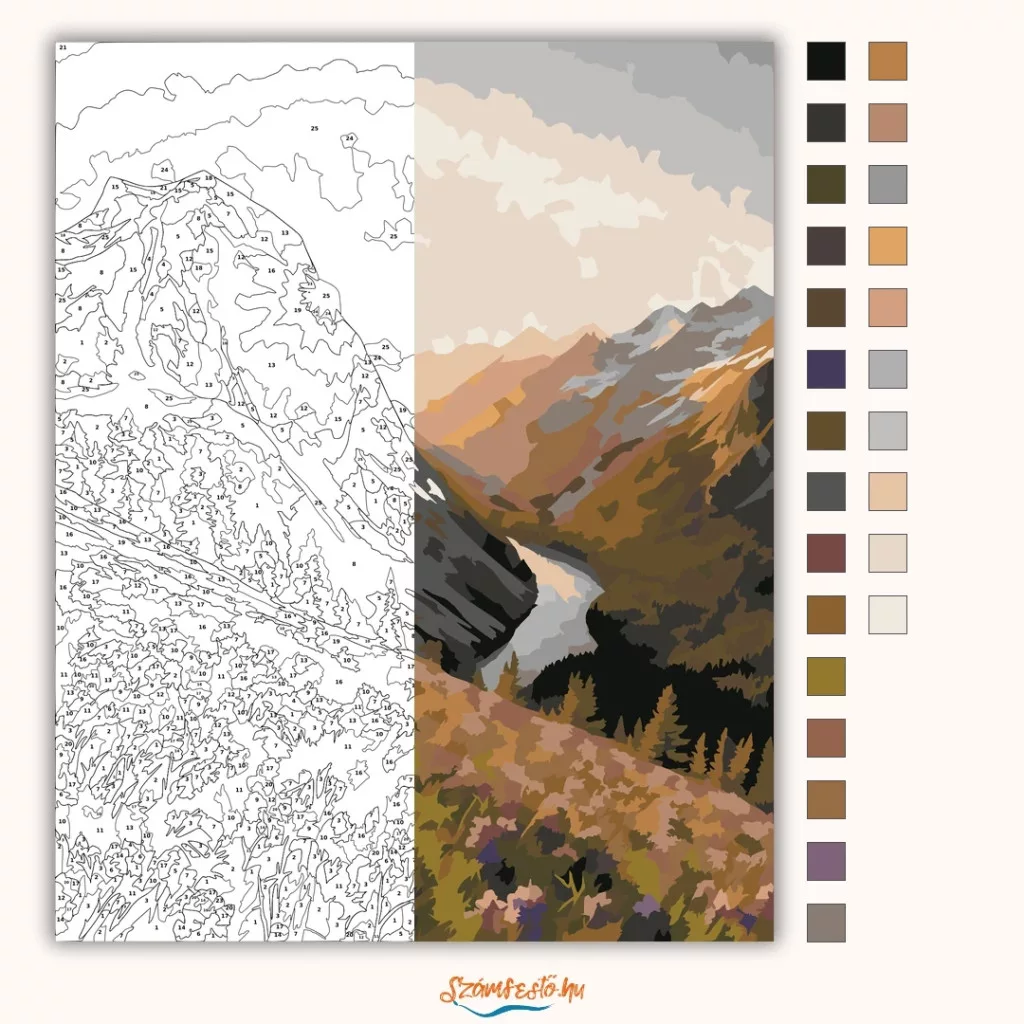 A képen egy hegyvidéki völgy tárul fel, ahol a napfelkelte első fényei aranylóan megvilágítják a sziklás csúcsokat. A völgyben egy kanyargó folyó fut, körülötte sötét fenyvesekkel. Előtérben vadvirágos rét látható, ami nyugodt, természetközeli hangulatot ad a látványnak. Díszítsd otthonodat saját kézzel készített műalkotással, vagy ajándékozd meg szeretteidet egy igazán különleges élménnyel! A számfestő készletben minden szükséges eszköz megtalálható a festmény elkészítéséhez.