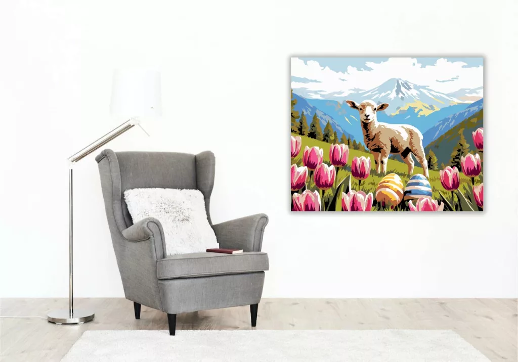 A képen egy bárány áll egy tavaszi hegyi réten, a háttérben havas hegycsúcsokkal és felhős éggel. Az előtérben nyíló tulipánok és két festett tojás teszik ünnepivé a látványt. A friss, vidám hangulatot a tiszta, élénk színek erősítik. Legyen a lakásod dísze vagy egy kedves meglepetés valaki számára – ez a számfestő készlet tökéletes választás mindkettőre. A készletben mindent megtalálsz, amivel lépésről lépésre megalkotható ez a gyönyörű festmény.