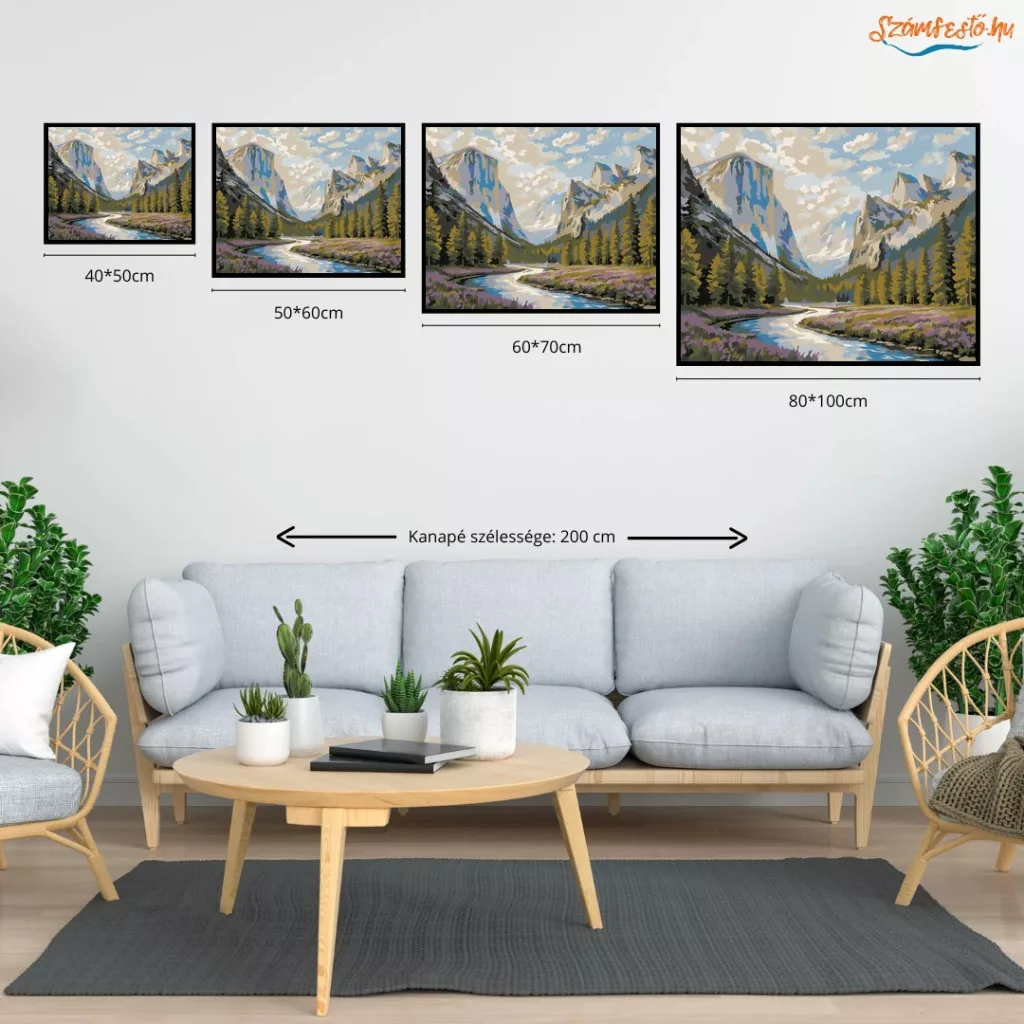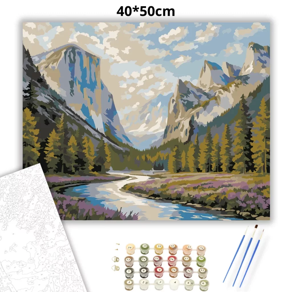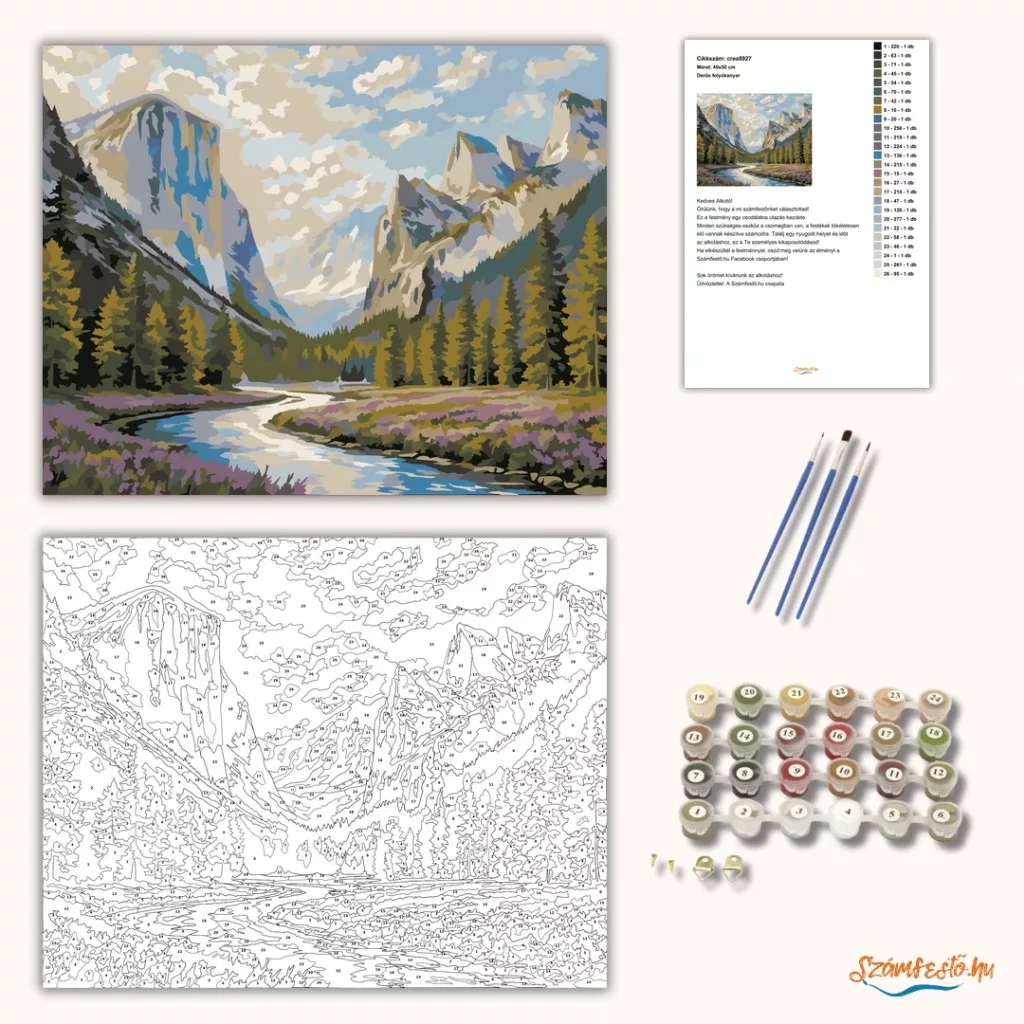 A képen egy hegyekkel ölelt völgy látható, ahol egy kanyargó folyó vezeti a tekintetet a távolba. A fenyőerdők és a virágos rét nyugodt, friss természetközeli hangulatot adnak. A magas sziklafalak és a felhős ég látványa igazán látványos, mégis békés összképet teremt. Díszítsd otthonodat saját kézzel készített műalkotással, vagy ajándékozd meg szeretteidet egy igazán különleges élménnyel! A számfestő készletben minden szükséges eszköz megtalálható a festmény elkészítéséhez.