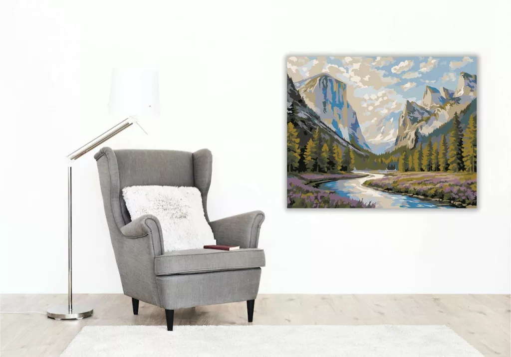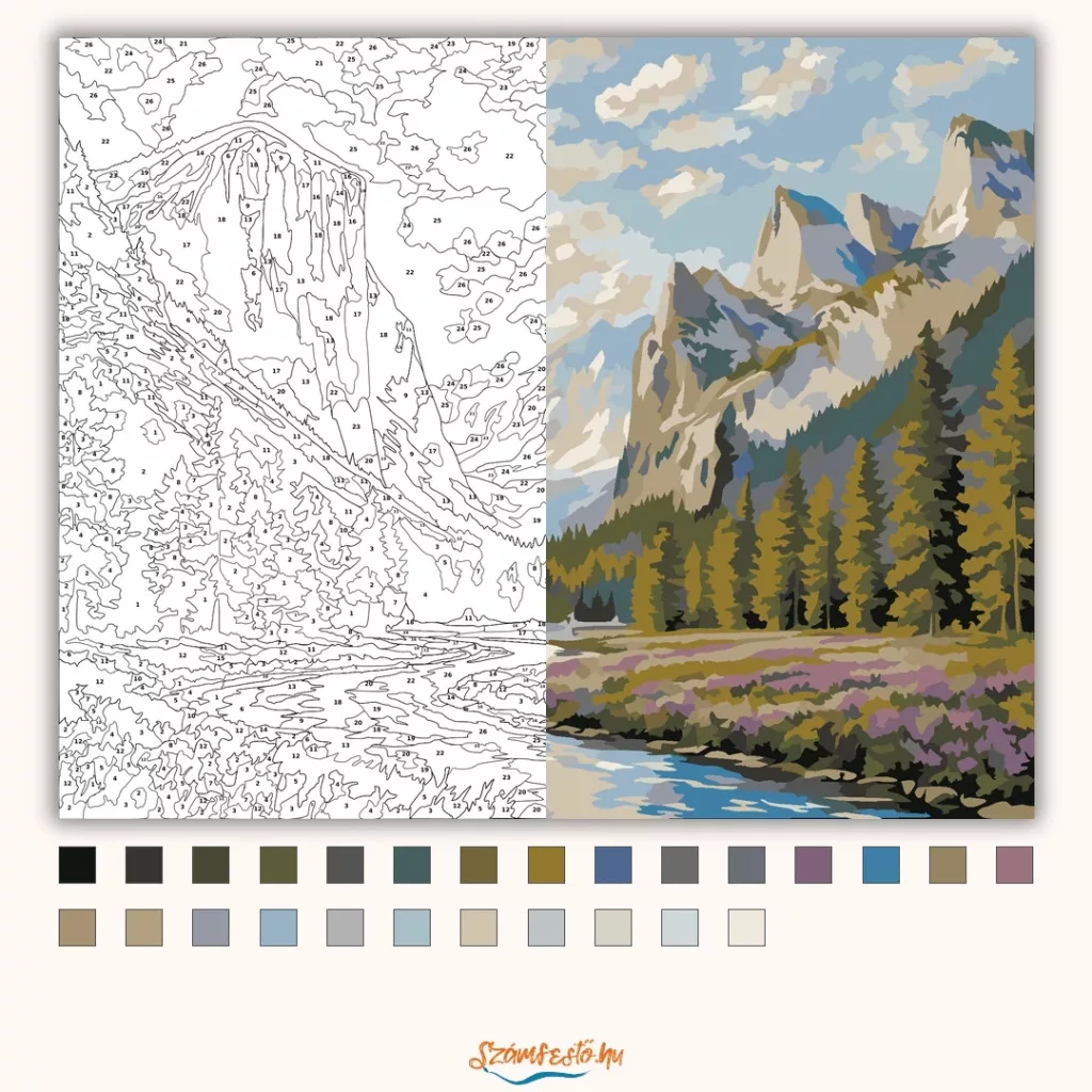 A képen egy hegyekkel ölelt völgy látható, ahol egy kanyargó folyó vezeti a tekintetet a távolba. A fenyőerdők és a virágos rét nyugodt, friss természetközeli hangulatot adnak. A magas sziklafalak és a felhős ég látványa igazán látványos, mégis békés összképet teremt. Ez a számfestő készlet tökéletes választás, ha egyedi dekorációval tennéd szebbé otthonodat, vagy ha különleges ajándékot keresel. A csomagban minden megtalálható, amire a festéshez szükséged van.