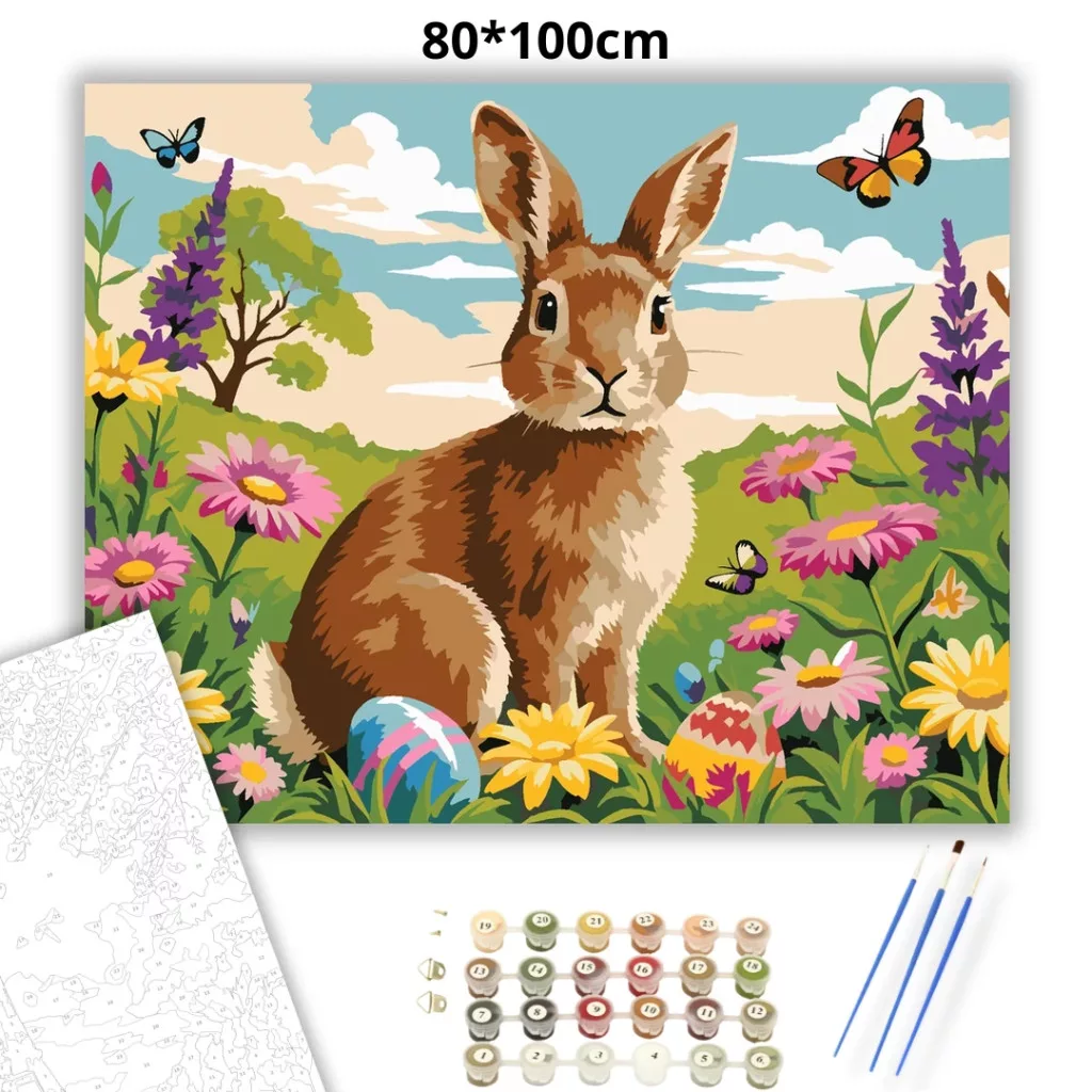 A képen egy aranybarna nyuszi ül egy virágos réten, körülötte tavaszi virágokkal és két festett tojással. A háttérben zöld dombok, egy fa és felhős ég látható, a levegőben pillangókkal. Vidám, friss hangulatú jelenet sok kedves részlettel. Ez a számfestő készlet tökéletes választás, ha egyedi dekorációval tennéd szebbé otthonodat, vagy ha különleges ajándékot keresel. A csomagban minden megtalálható, amire a festéshez szükséged van.