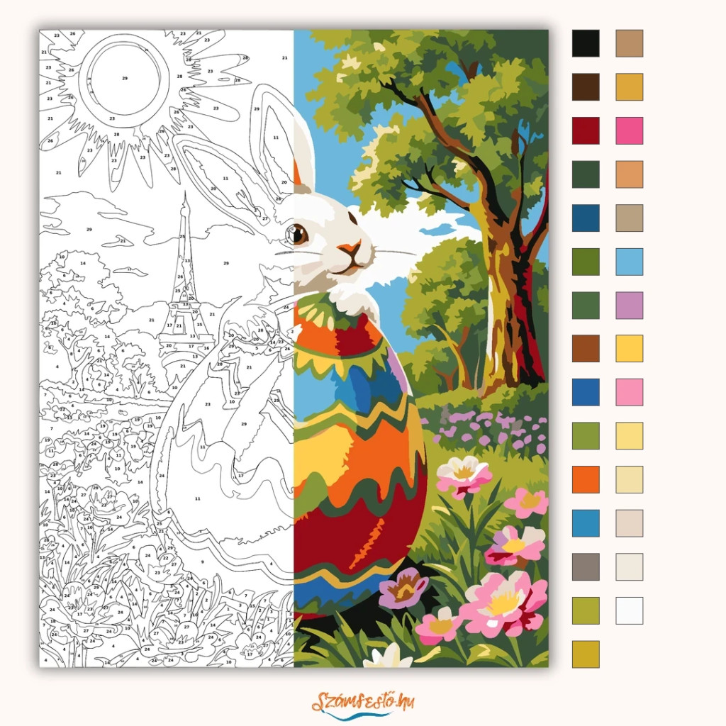 A képen egy fehér nyuszi bújik elő egy nagy, színes húsvéti tojás mögül egy virágos parkban. A háttérben az Eiffel-torony látszik, felette ragyogó nappali égbolttal. Vidám, tavaszi hangulatú jelenet élénk, meleg színekkel. Engedd szabadjára a kreativitásodat, és alkoss egy különleges műalkotást, amely otthonod dísze lehet de egyedi ajándékként is kiváló. A számfestő készletben minden szükséges eszközt megtalálsz a tökéletes végeredményhez.