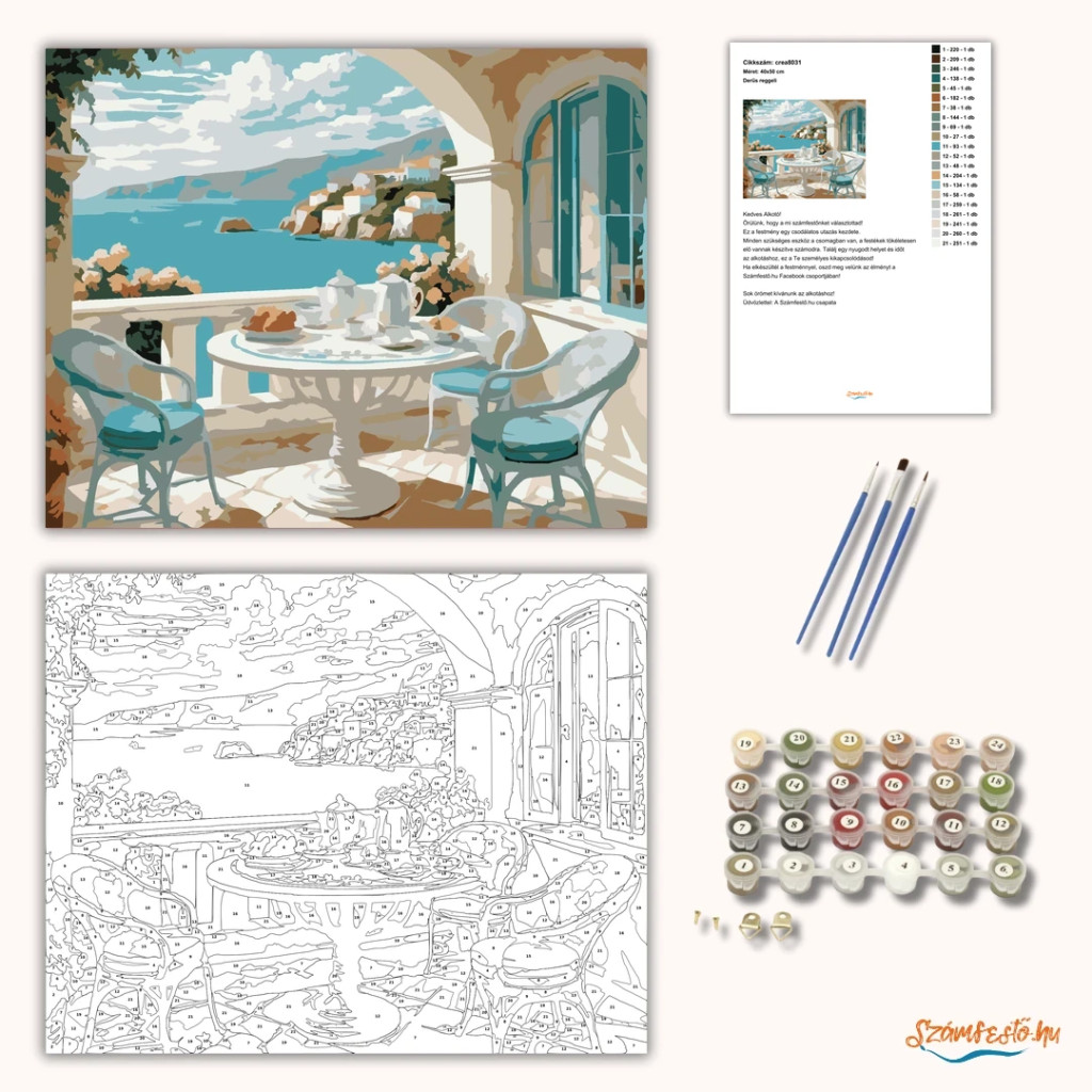 A képen egy terasz látható kerek asztallal és két székkel, az asztalon teáskanna, csészék és egy tányér sütemény. A háttérben nyugodt tenger, felhős ég és a parton fehér házak sora látszik. Világos, napfényes hangulatú jelenet, sok türkizes és homokszín árnyalattal. Ez a számfestő készlet tökéletes választás, ha egyedi dekorációval tennéd szebbé otthonodat, vagy ha különleges ajándékot keresel. A csomagban minden megtalálható, amire a festéshez szükséged van.