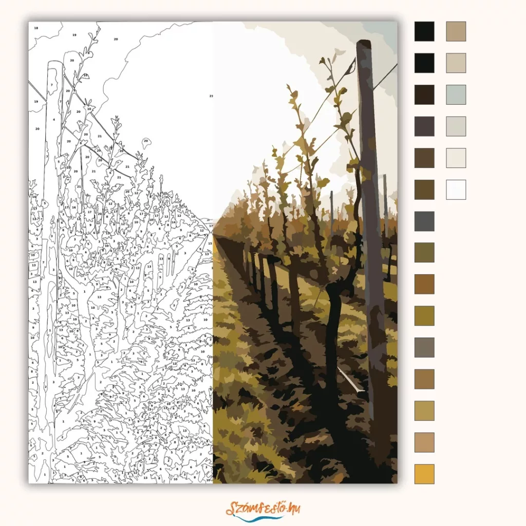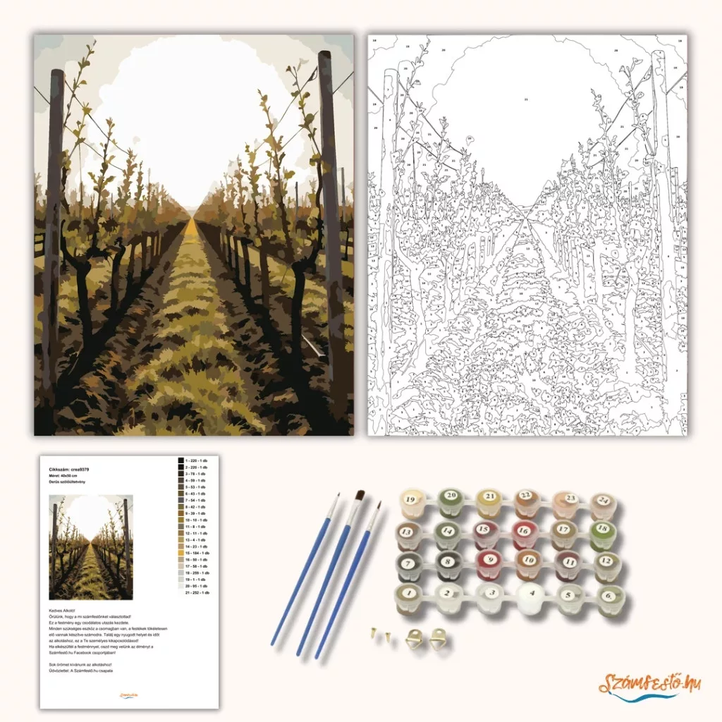A képen egy szőlőültetvény hosszú, egyenes sorai futnak a távolba, két oldalt karókkal és huzalokkal vezetett tőkékkel. A friss, rügyfakadó hajtások és a földút nyugodt, vidéki hangulatot adnak. A meleg, természetes árnyalatok kellemes, napfényes érzetet keltenek. Legyen a lakásod dísze vagy egy kedves meglepetés valaki számára – ez a számfestő készlet tökéletes választás mindkettőre. A készletben mindent megtalálsz, amivel lépésről lépésre megalkotható ez a gyönyörű festmény.