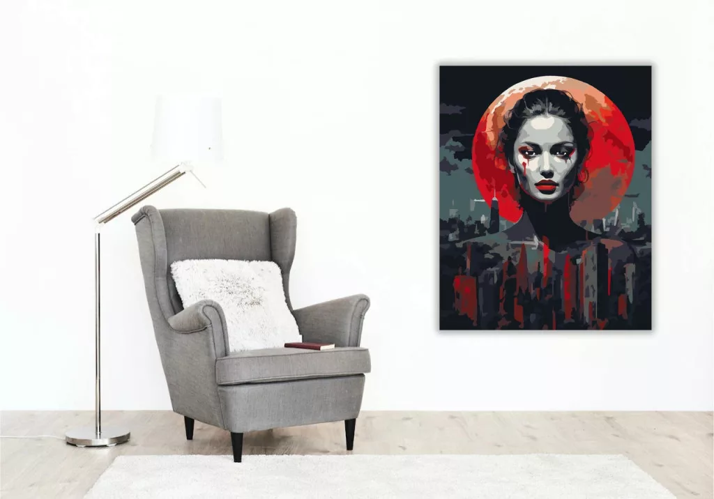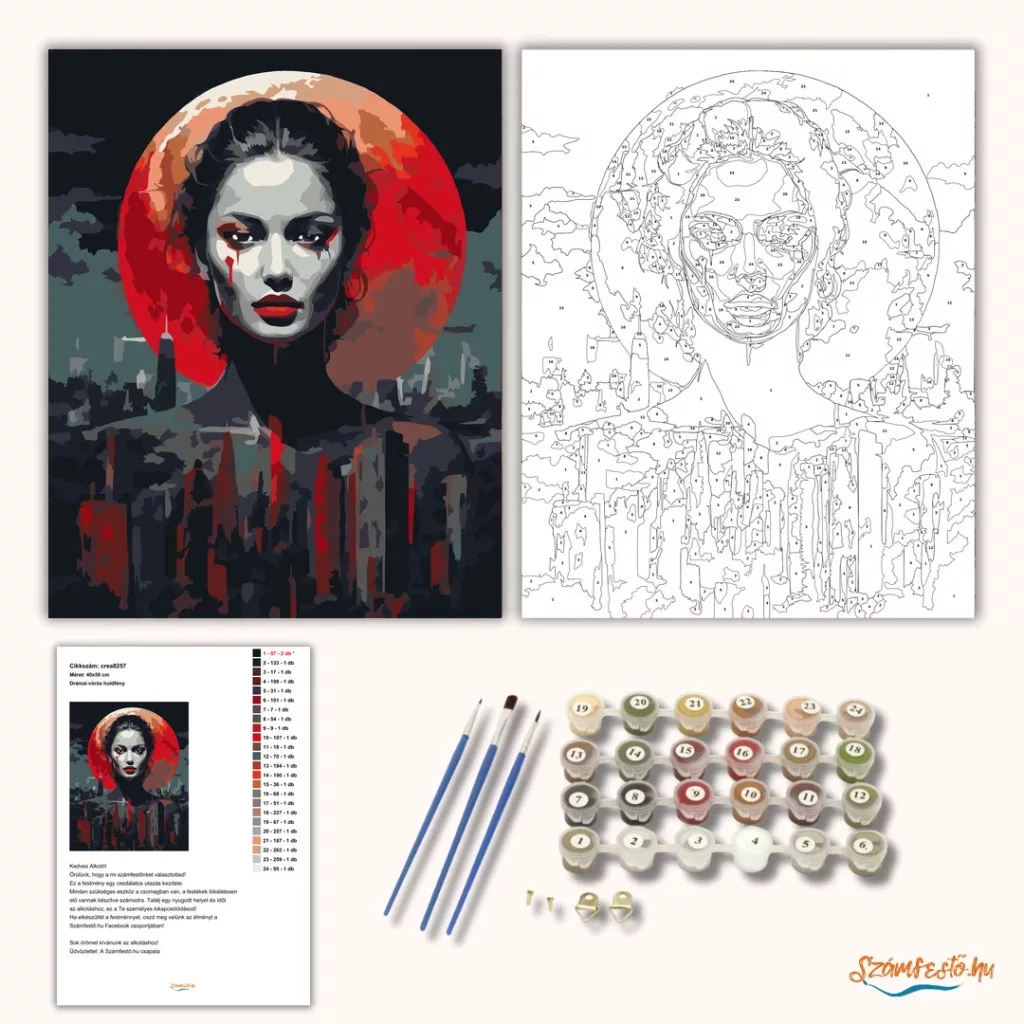 A képen egy női arc látható, amelybe egy sötét városi látkép olvad bele, mintha a felhőkarcolók a portré részei lennének. A háttérben egy hatalmas vörös hold ragyog, körülötte sötét felhőkkel. A kép hangulata titokzatos és drámai, erős kontrasztokkal és mély árnyékokkal. Varázsolj egyedi hangulatot otthonodba ezzel a gyönyörű számfestő készlettel, amely tökéletes ajándék is lehet szeretteid számára. A csomag mindent tartalmaz, amire szükséged van ahhoz, hogy saját kezűleg alkoss egy lenyűgöző festményt.
