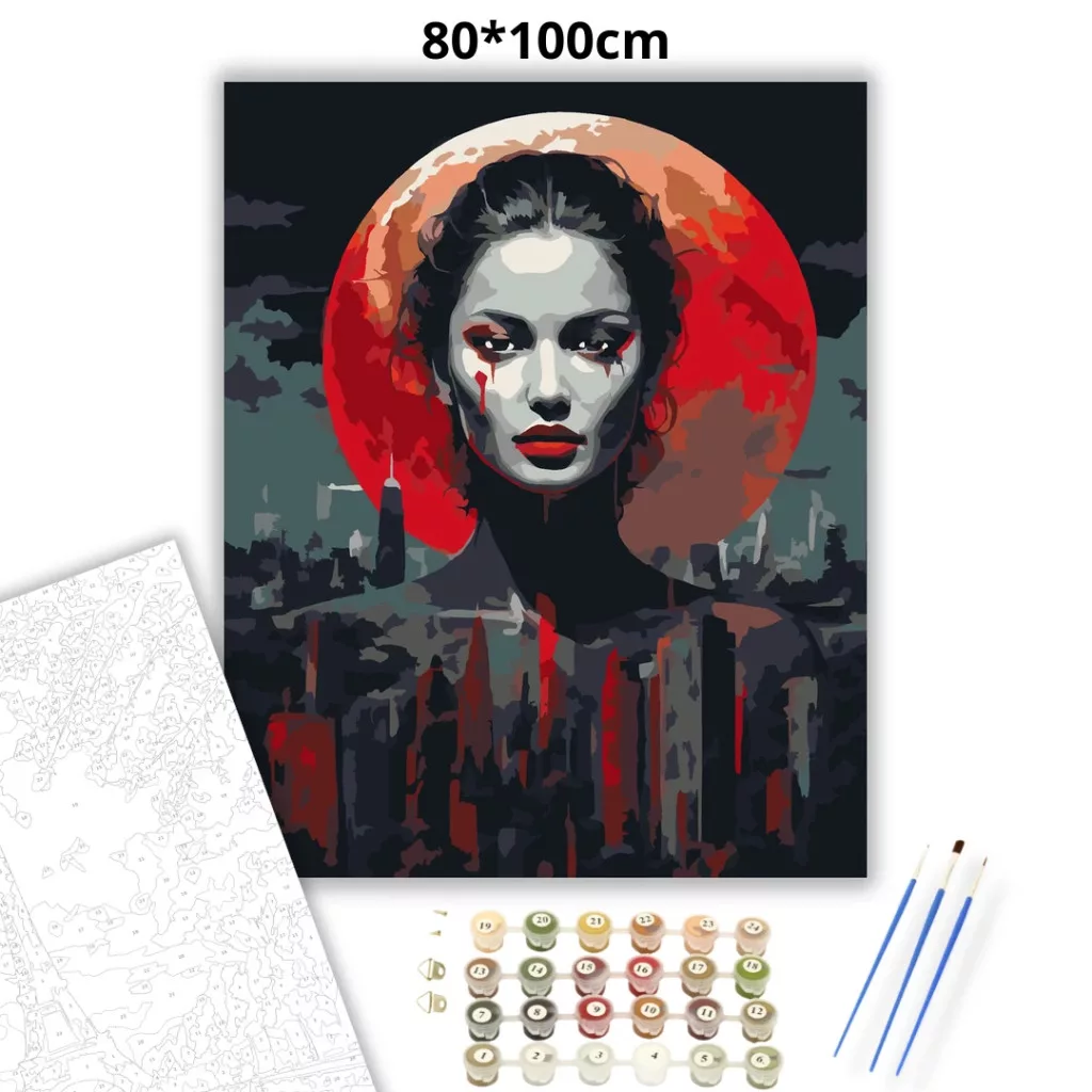 A képen egy női arc látható, amelybe egy sötét városi látkép olvad bele, mintha a felhőkarcolók a portré részei lennének. A háttérben egy hatalmas vörös hold ragyog, körülötte sötét felhőkkel. A kép hangulata titokzatos és drámai, erős kontrasztokkal és mély árnyékokkal. Díszítsd otthonodat saját kézzel készített műalkotással, vagy ajándékozd meg szeretteidet egy igazán különleges élménnyel! A számfestő készletben minden szükséges eszköz megtalálható a festmény elkészítéséhez.