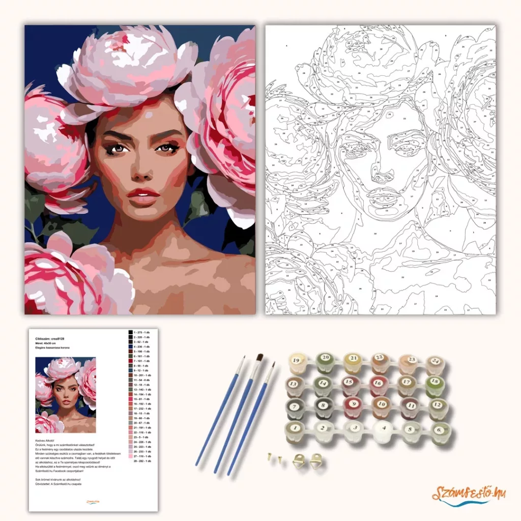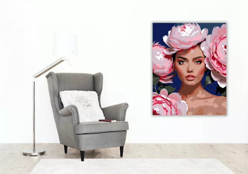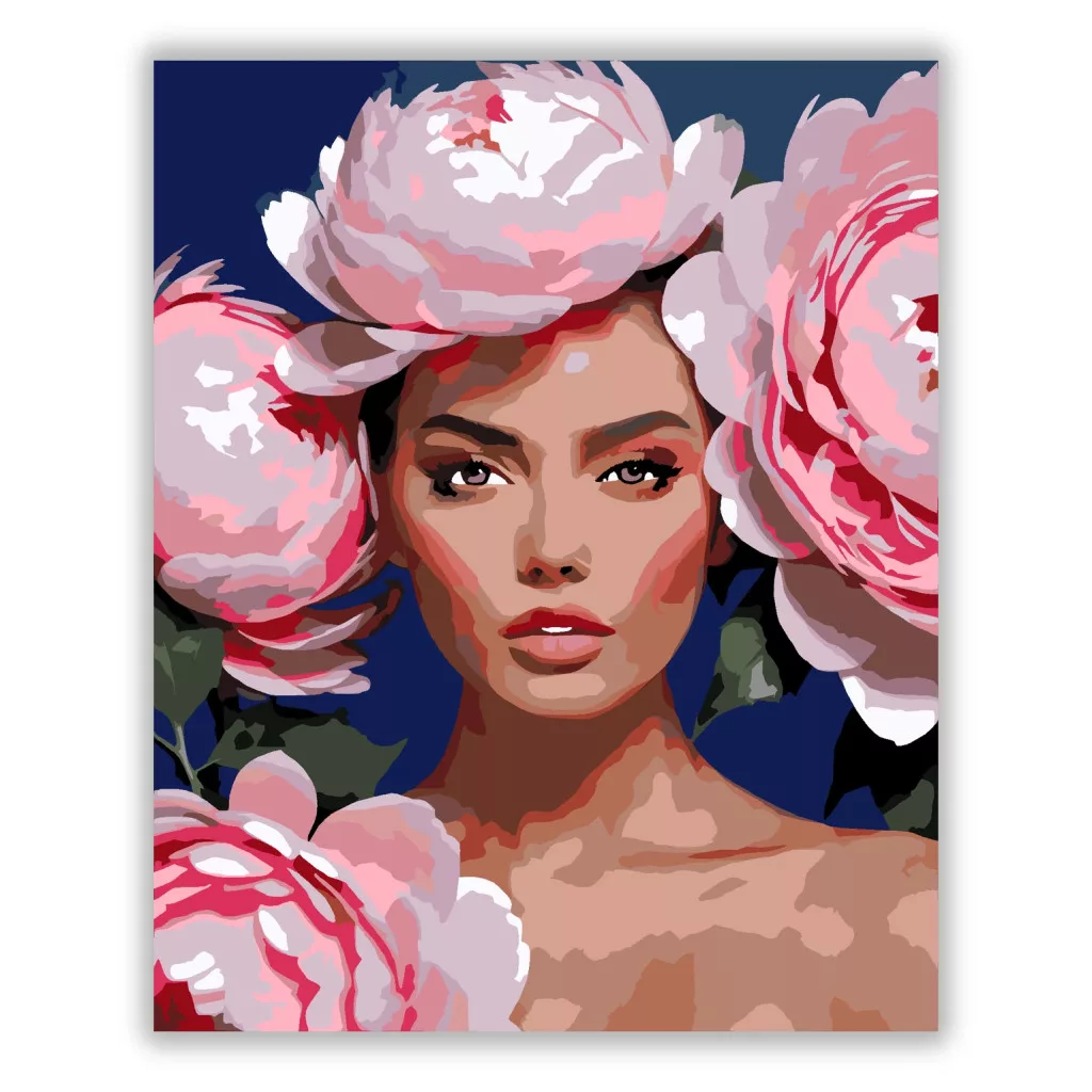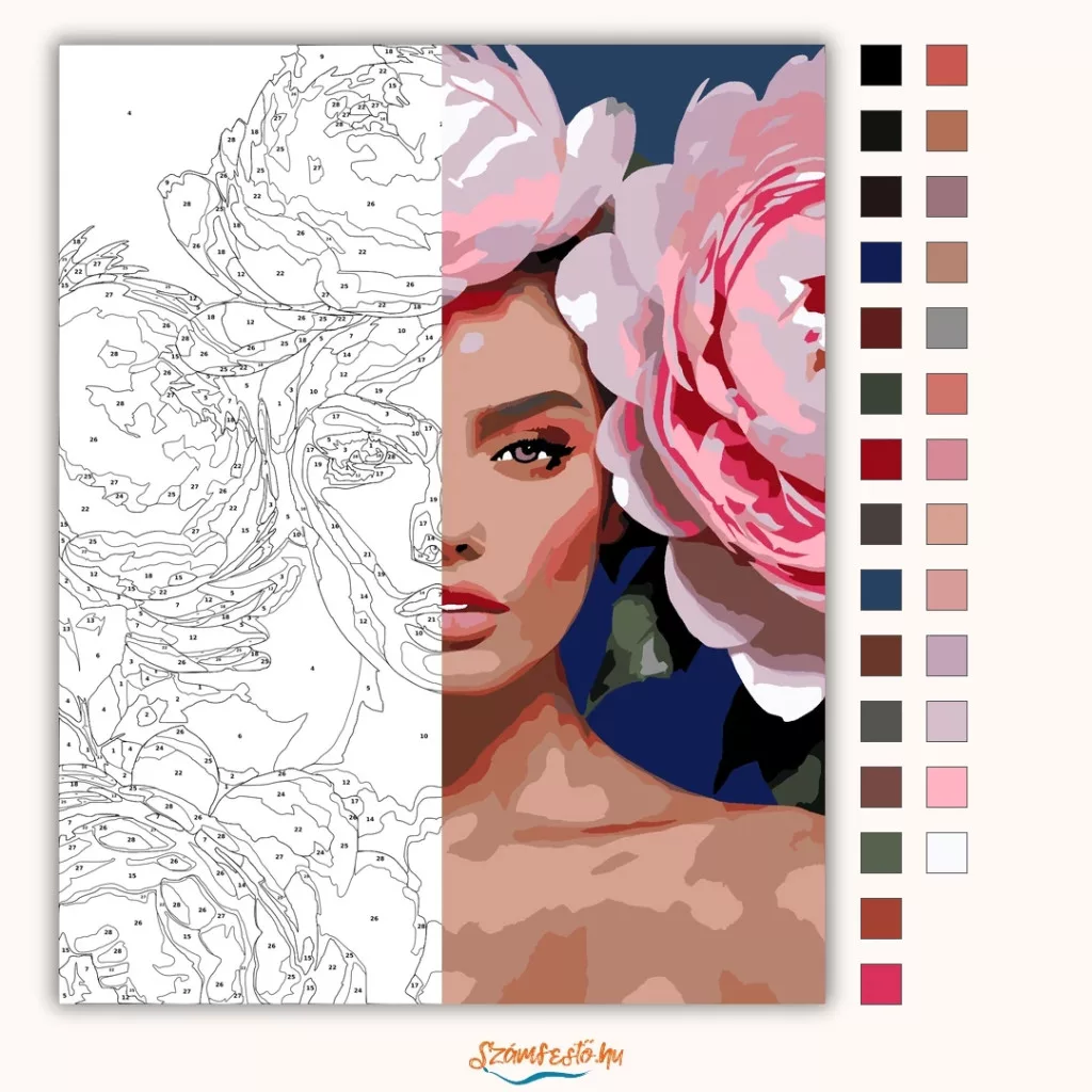 A képen egy női portré látható, nagy virágokkal körülvéve a fején és a kép szélein. A virágok és az arc lágy, rózsaszínes árnyalatai erős kontrasztot adnak a sötét háttérrel. Elegáns, figyelemfelkeltő hangulatú kép, amely a tekintetre és a virágokra helyezi a hangsúlyt. Díszítsd otthonodat saját kézzel készített műalkotással, vagy ajándékozd meg szeretteidet egy igazán különleges élménnyel! A számfestő készletben minden szükséges eszköz megtalálható a festmény elkészítéséhez.