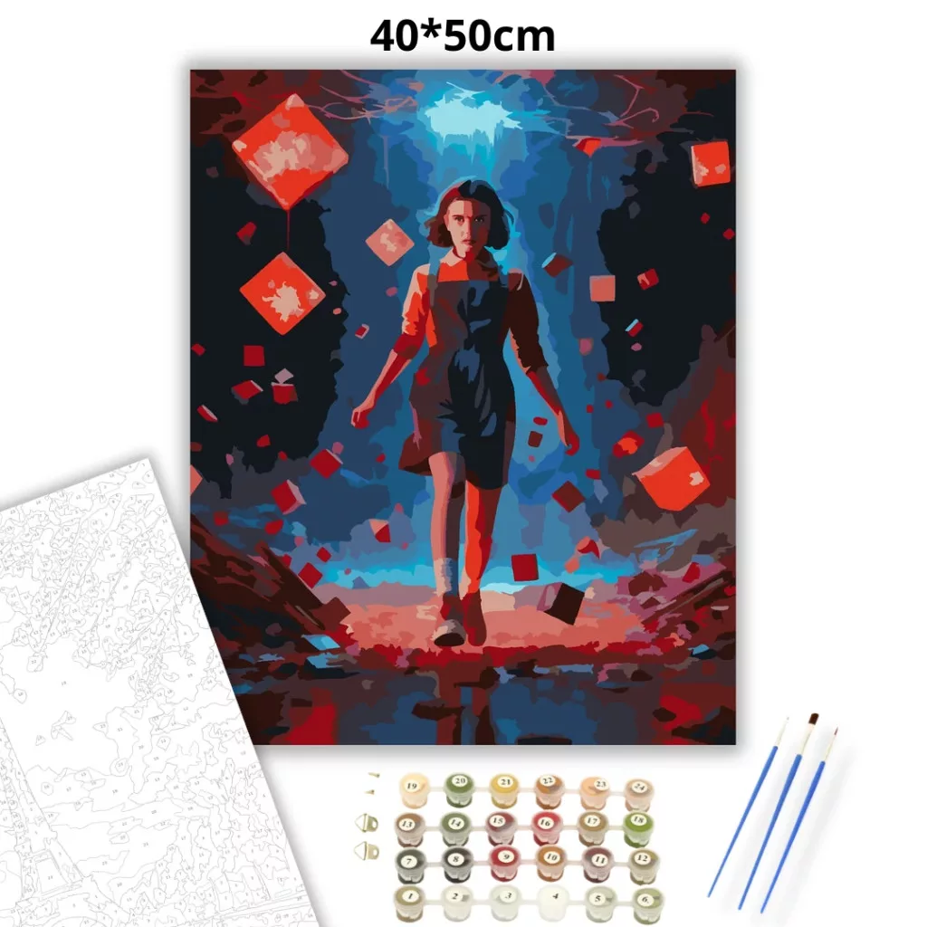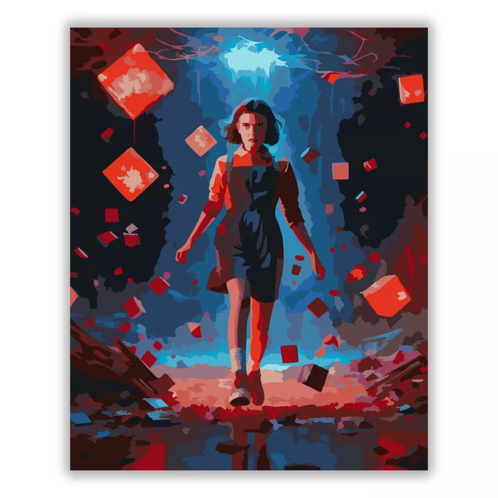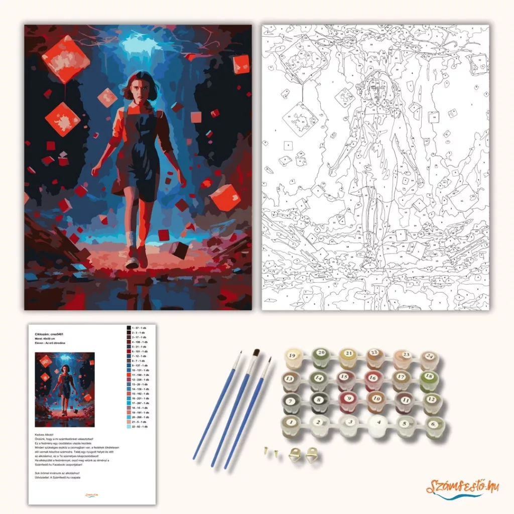 A képen Eleven látható a Stranger Things világából, amint előrelép egy sötét, vörös és kék fényekkel átitatott térben. Körülötte tárgyak lebegnek, mintha gondolataival irányítaná őket, miközben tekintete fókuszált és erőt sugároz. A háttér a Másik Oldal nyomasztó hangulatát idézi meg, a jelenet pedig a karakter rendkívüli képességeit és belső erejét emeli ki. Varázsolj egyedi hangulatot otthonodba ezzel a gyönyörű számfestő készlettel, amely tökéletes ajándék is lehet szeretteid számára. A csomag mindent tartalmaz, amire szükséged van ahhoz, hogy saját kezűleg alkoss egy lenyűgöző festményt.