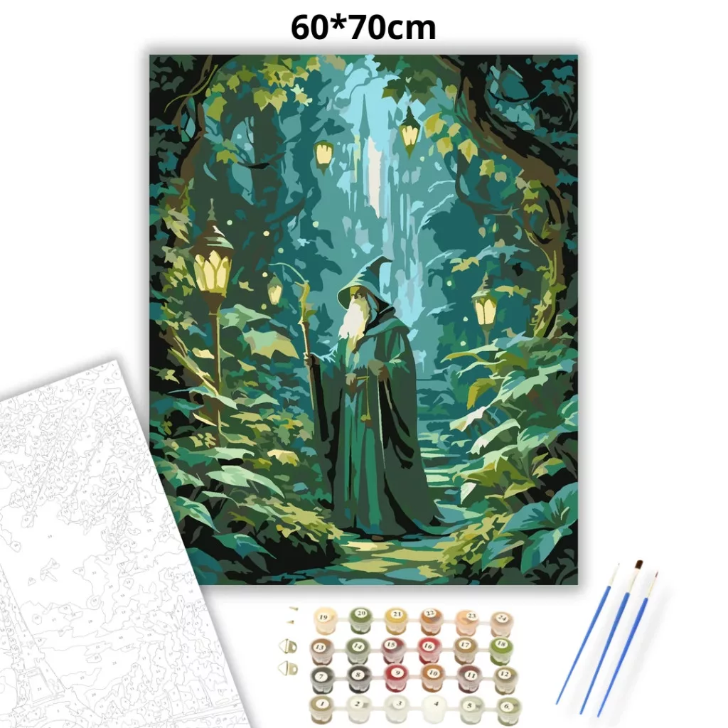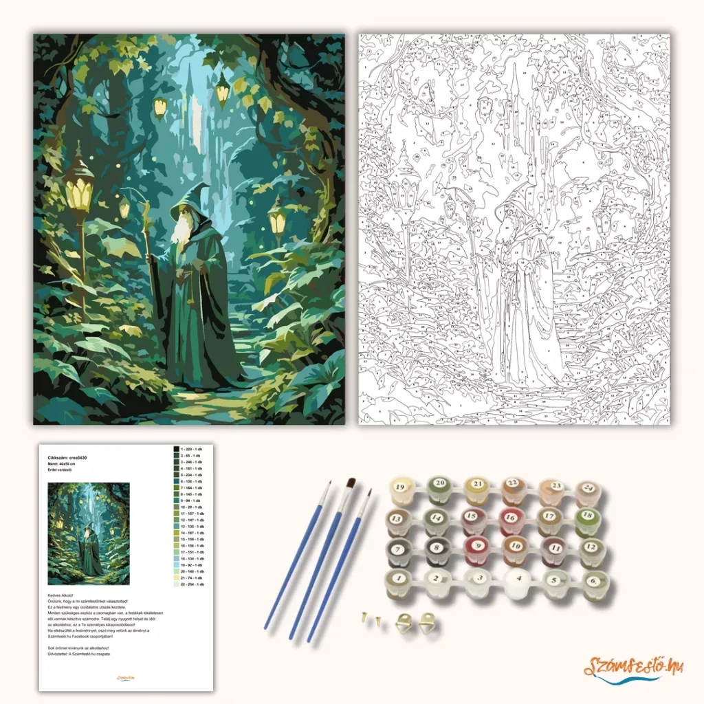 Egy rejtett, sűrű lombú kertben egy zöld köpenyes, hosszú szakállú varázsló áll botjára támaszkodva. A levelek között apró fények derengenek, körülötte pedig lámpások világítják meg a kanyargó ösvényt. A hűvös zöld és türkiz árnyalatok nyugodt, mesés hangulatot adnak a jelenetnek. Ez a számfestő készlet tökéletes választás, ha egyedi dekorációval tennéd szebbé otthonodat, vagy ha különleges ajándékot keresel. A csomagban minden megtalálható, amire a festéshez szükséged van.