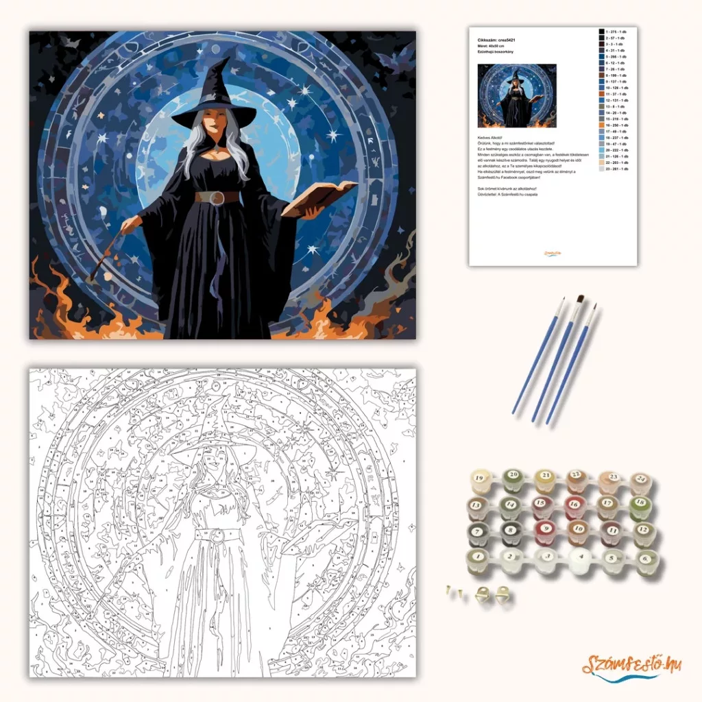A képen egy ezüst hajú boszorkány áll egy fénylő mágikus kör előtt, kezében egy nyitott varázskönyvvel, a másik kezében pálcával. A háttérben csillagok és holdfázisokkal díszített körgyűrűk láthatók, alul pedig lángok villannak fel. A mély kék és sötét árnyalatok misztikus, varázslatos hangulatot adnak a jelenetnek. Legyen a lakásod dísze vagy egy kedves meglepetés valaki számára – ez a számfestő készlet tökéletes választás mindkettőre. A készletben mindent megtalálsz, amivel lépésről lépésre megalkotható ez a gyönyörű festmény.