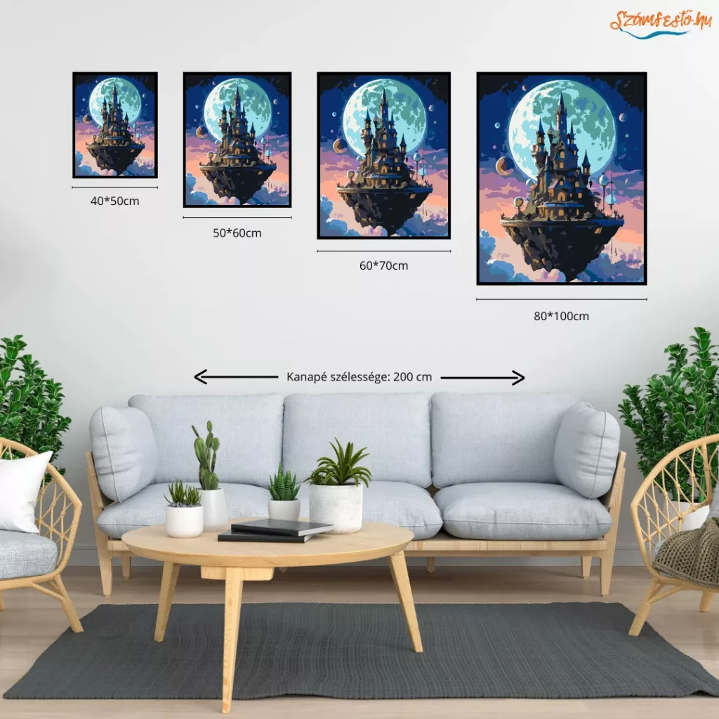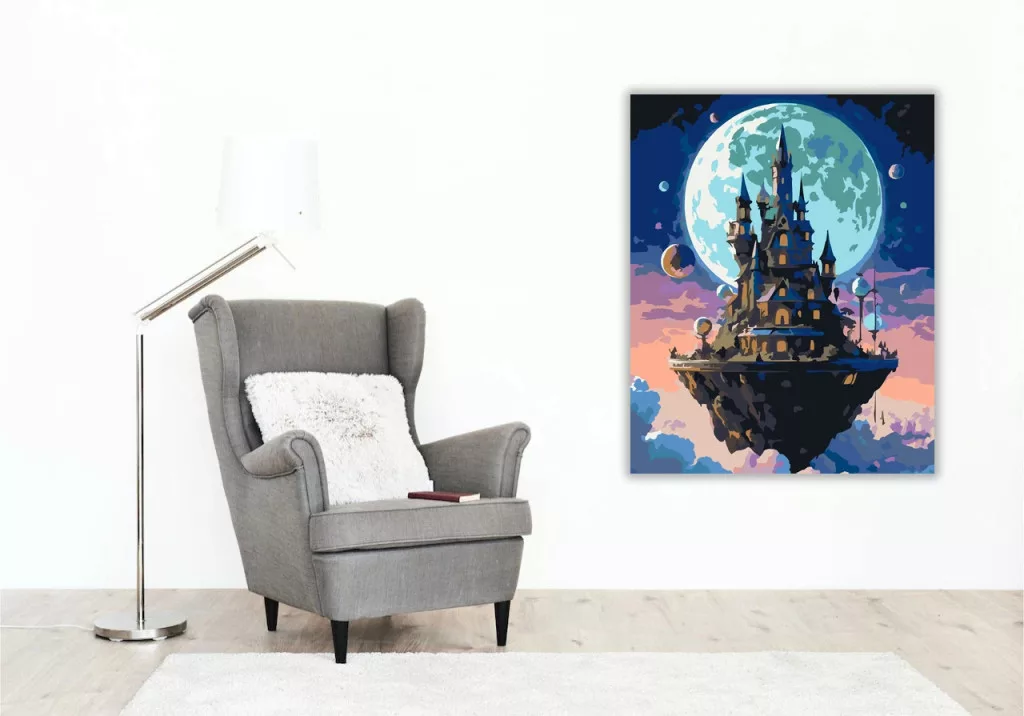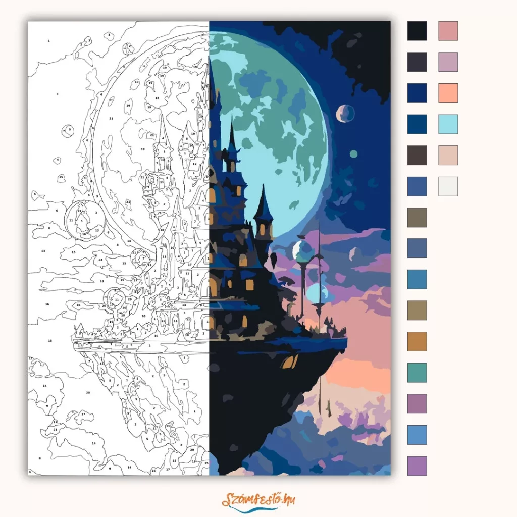 Egy felhők fölött lebegő csillagvizsgáló látható, tornyokkal és meleg fényű ablakokkal. A háttérben hatalmas hold ragyog, körülötte kisebb égitestek úsznak az éjszakai égben. A kép titokzatos, mesés hangulatot áraszt, kékes-lilás és barackos árnyalatokkal. Díszítsd otthonodat saját kézzel készített műalkotással, vagy ajándékozd meg szeretteidet egy igazán különleges élménnyel! A számfestő készletben minden szükséges eszköz megtalálható a festmény elkészítéséhez.
