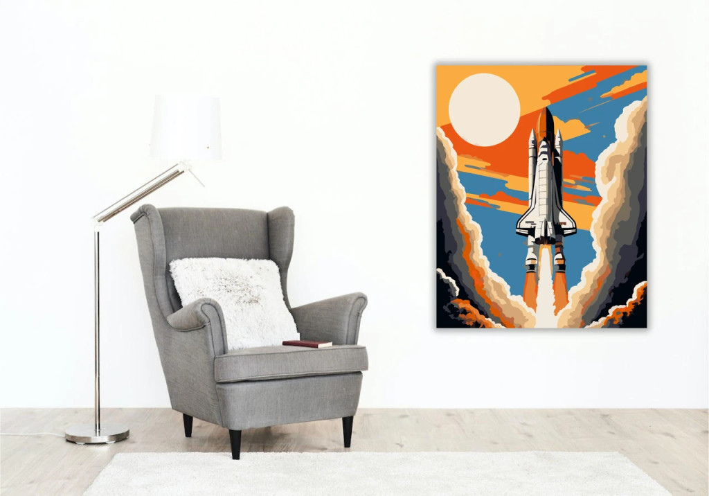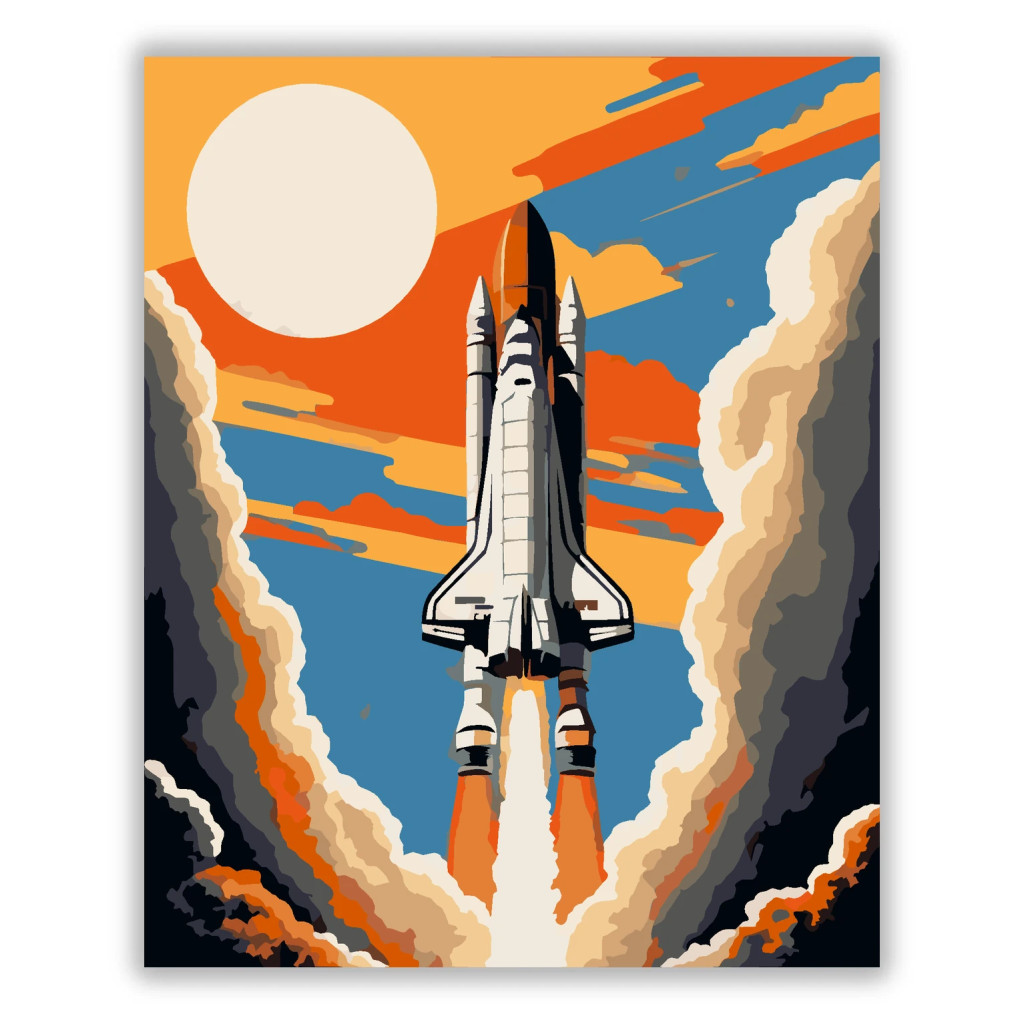 A képen egy űrsikló felszállása látható, alatta erős lángcsóvával és hatalmas füstfelhőkkel. A háttérben nagy napkorong és narancsos napsugarak futnak végig az égen. Lendületes, látványos, sci-fi hangulatú kép merész színekkel. Engedd szabadjára a kreativitásodat, és alkoss egy különleges műalkotást, amely otthonod dísze lehet de egyedi ajándékként is kiváló. A számfestő készletben minden szükséges eszközt megtalálsz a tökéletes végeredményhez.