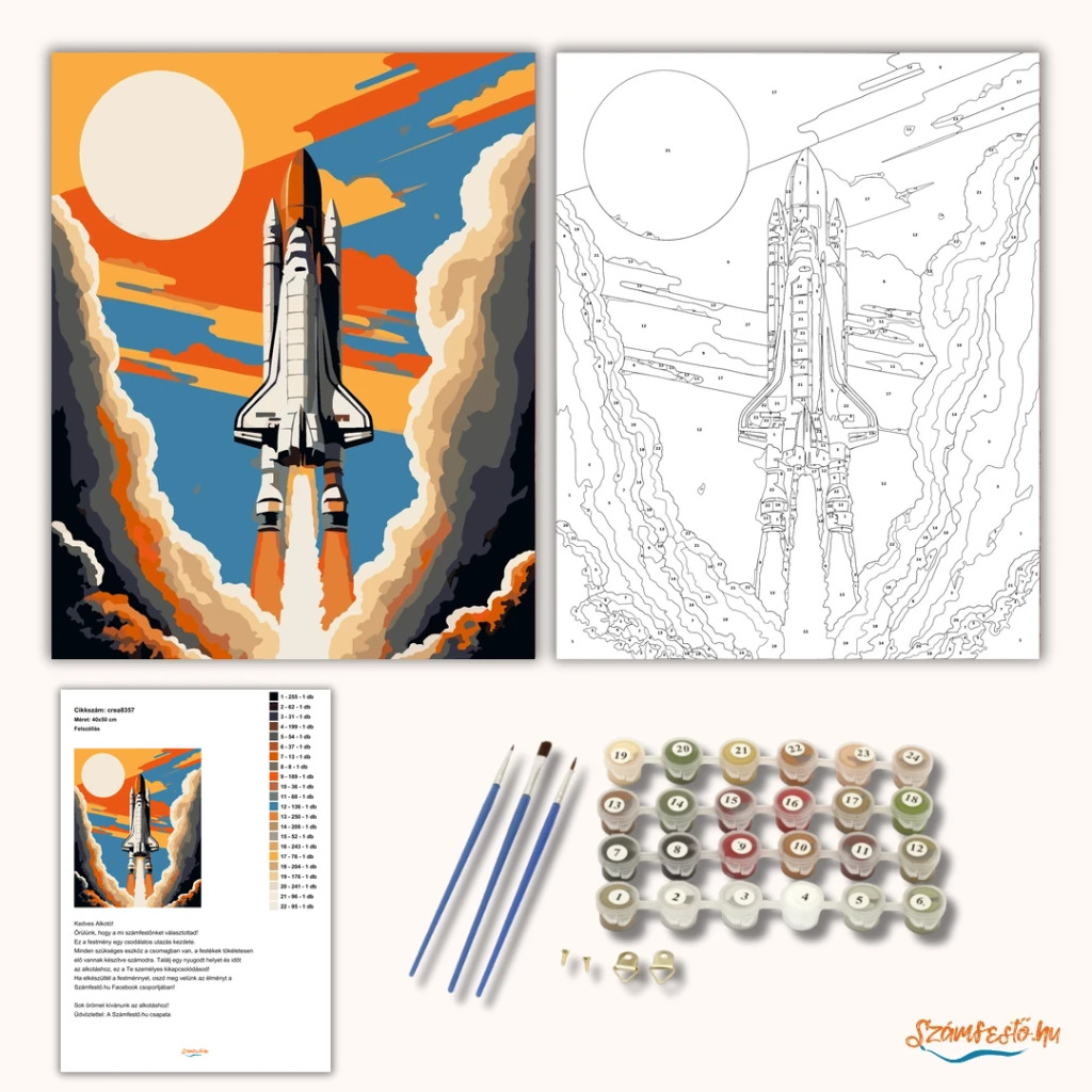 A képen egy űrsikló felszállása látható, alatta erős lángcsóvával és hatalmas füstfelhőkkel. A háttérben nagy napkorong és narancsos napsugarak futnak végig az égen. Lendületes, látványos, sci-fi hangulatú kép merész színekkel. Varázsolj egyedi hangulatot otthonodba ezzel a gyönyörű számfestő készlettel, amely tökéletes ajándék is lehet szeretteid számára. A csomag mindent tartalmaz, amire szükséged van ahhoz, hogy saját kezűleg alkoss egy lenyűgöző festményt.