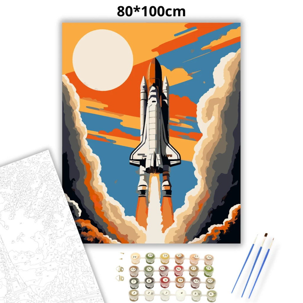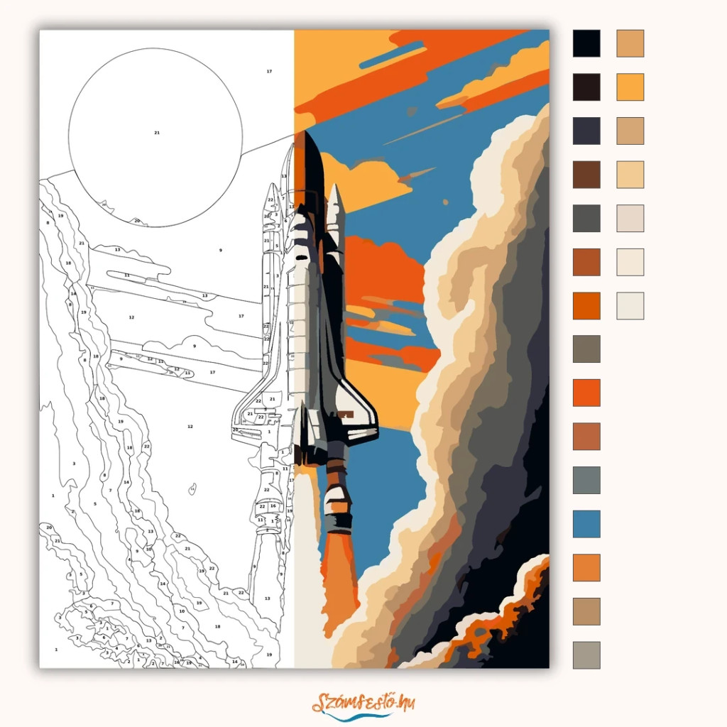 A képen egy űrsikló felszállása látható, alatta erős lángcsóvával és hatalmas füstfelhőkkel. A háttérben nagy napkorong és narancsos napsugarak futnak végig az égen. Lendületes, látványos, sci-fi hangulatú kép merész színekkel. Díszítsd otthonodat saját kézzel készített műalkotással, vagy ajándékozd meg szeretteidet egy igazán különleges élménnyel! A számfestő készletben minden szükséges eszköz megtalálható a festmény elkészítéséhez.