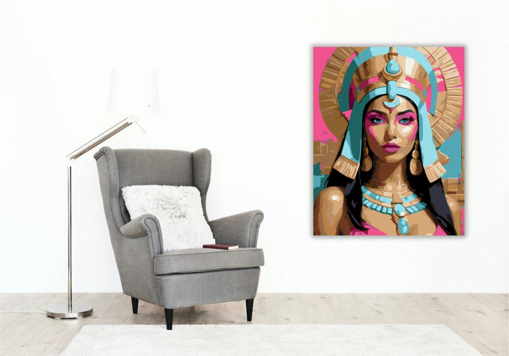 A képen egy női alak látható díszes, egyiptomi jellegű fejdísszel és nagy, kör alakú háttérelemmel. A tekintet hangsúlyos, erős sminkkel és élénk rózsaszín háttérrel. A nyakán széles nyakék és lelógó ékszerdíszek látszanak. Legyen a lakásod dísze vagy egy kedves meglepetés valaki számára – ez a számfestő készlet tökéletes választás mindkettőre. A készletben mindent megtalálsz, amivel lépésről lépésre megalkotható ez a gyönyörű festmény.