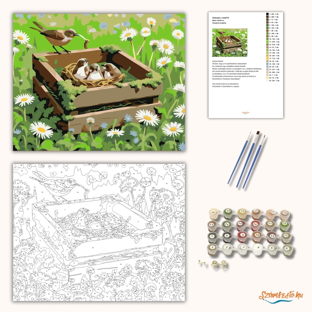 A képen egy mohával benőtt faláda látható egy tavaszi mezőben, benne fészekkel és három fiókával. A láda szélén egy kis madár áll, mintha éppen etetni készülne. A zöld háttér és a fehér margaréták nyugodt, friss hangulatot adnak a jelenetnek. Varázsolj egyedi hangulatot otthonodba ezzel a gyönyörű számfestő készlettel, amely tökéletes ajándék is lehet szeretteid számára. A csomag mindent tartalmaz, amire szükséged van ahhoz, hogy saját kezűleg alkoss egy lenyűgöző festményt.