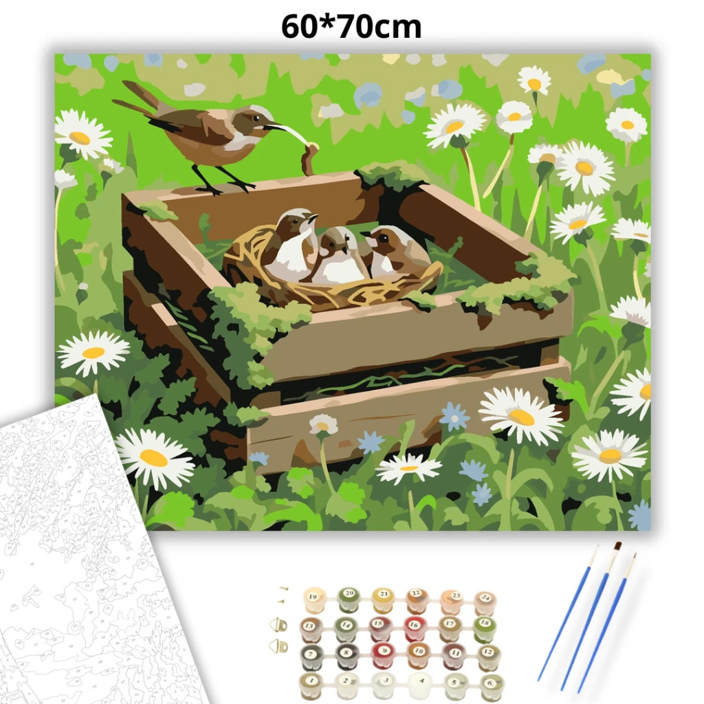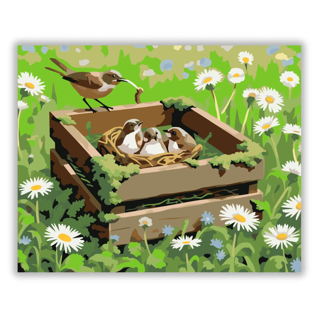 A képen egy mohával benőtt faláda látható egy tavaszi mezőben, benne fészekkel és három fiókával. A láda szélén egy kis madár áll, mintha éppen etetni készülne. A zöld háttér és a fehér margaréták nyugodt, friss hangulatot adnak a jelenetnek. Ez a számfestő készlet tökéletes választás, ha egyedi dekorációval tennéd szebbé otthonodat, vagy ha különleges ajándékot keresel. A csomagban minden megtalálható, amire a festéshez szükséged van.