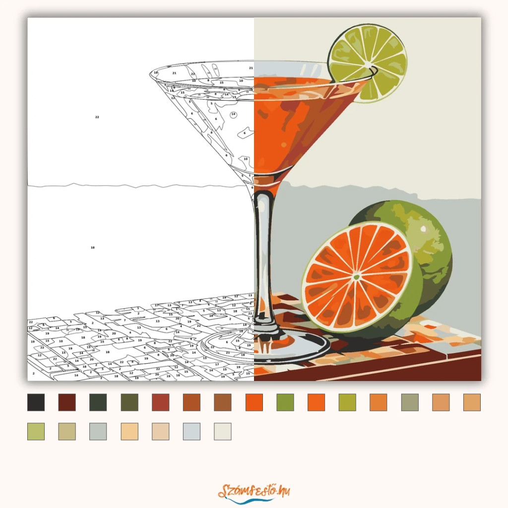 A képen egy daiquiri látható egy ívelt martinis pohárban, a peremén egy lime karikával. A meleg, vöröses-narancs ital és a mozaikos asztallap együtt vidám, retro hangulatot ad. A háttér letisztult, így a pohár és a gyümölcsök szépen előtérbe kerülnek. Ez a számfestő készlet tökéletes választás, ha egyedi dekorációval tennéd szebbé otthonodat, vagy ha különleges ajándékot keresel. A csomagban minden megtalálható, amire a festéshez szükséged van.