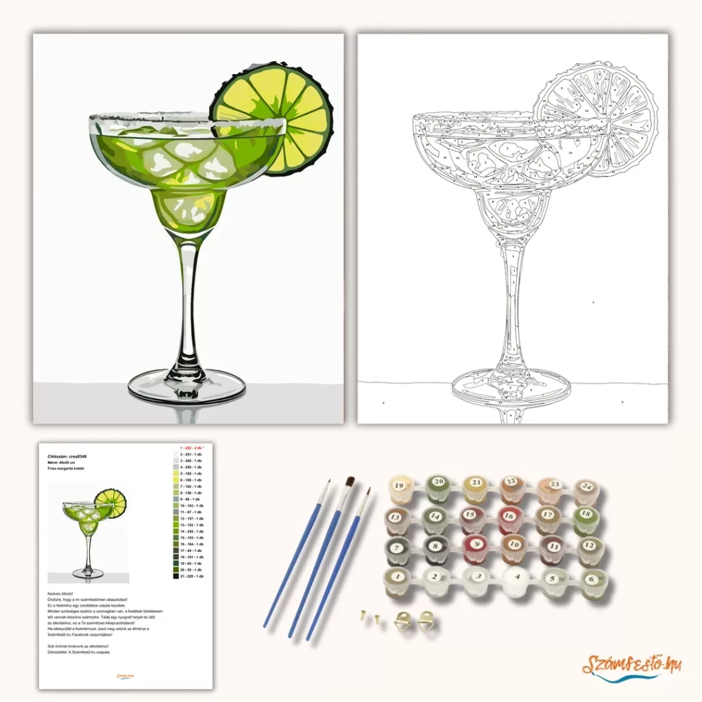 A képen egy margarita koktél látható jéggel egy talpas koktélpohárban. A pohár pereme kristálycukros hatású, a díszítés pedig egy limekarika. Friss, nyári hangulatú, letisztult fehér háttérrel. Varázsolj egyedi hangulatot otthonodba ezzel a gyönyörű számfestő készlettel, amely tökéletes ajándék is lehet szeretteid számára. A csomag mindent tartalmaz, amire szükséged van ahhoz, hogy saját kezűleg alkoss egy lenyűgöző festményt.