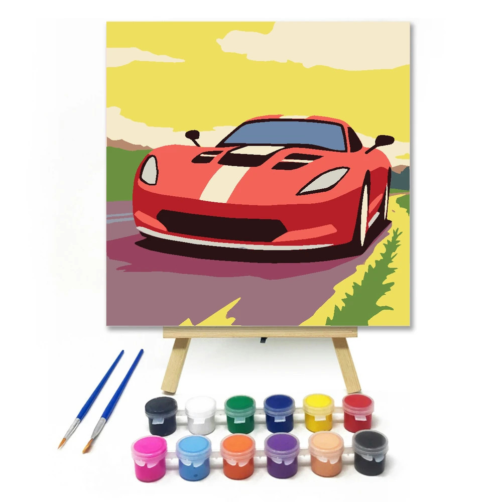 Ezen a képen egy menő piros sportkocsi száguld az országúton, fehér csíkkal a motorháztetőn. A háttérben sárga égbolt és zöld dombok látszanak. A piros, sárga és zöld színek igazán vidám hangulatot adnak. Varázsolj egyedi hangulatot otthonodba ezzel a gyönyörű számfestő készlettel, amely tökéletes ajándék is lehet szeretteid számára. A csomag mindent tartalmaz, amire szükséged van ahhoz, hogy saját kezűleg alkoss egy lenyűgöző festményt.