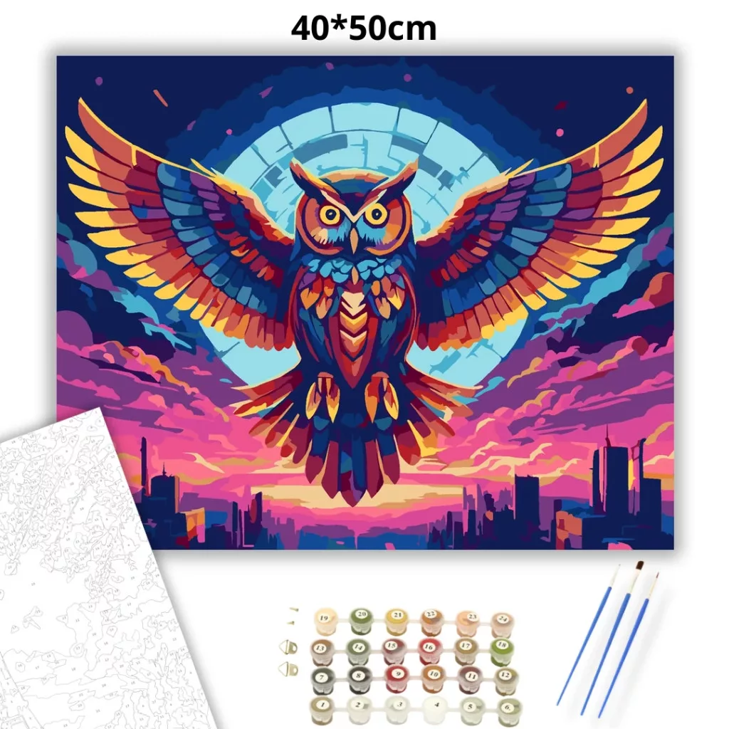 A képen egy színes bagoly látható, amely kitárt szárnyakkal repül egy neonfényű égbolt alatt. A ragyogó szemek és a színes tollazat erőteljes, futurisztikus hangulatot adnak. Alatta egy város sziluettje rajzolódik ki, a háttérben egy nagy, kör alakú fényudvarral. Díszítsd otthonodat saját kézzel készített műalkotással, vagy ajándékozd meg szeretteidet egy igazán különleges élménnyel! A számfestő készletben minden szükséges eszköz megtalálható a festmény elkészítéséhez.