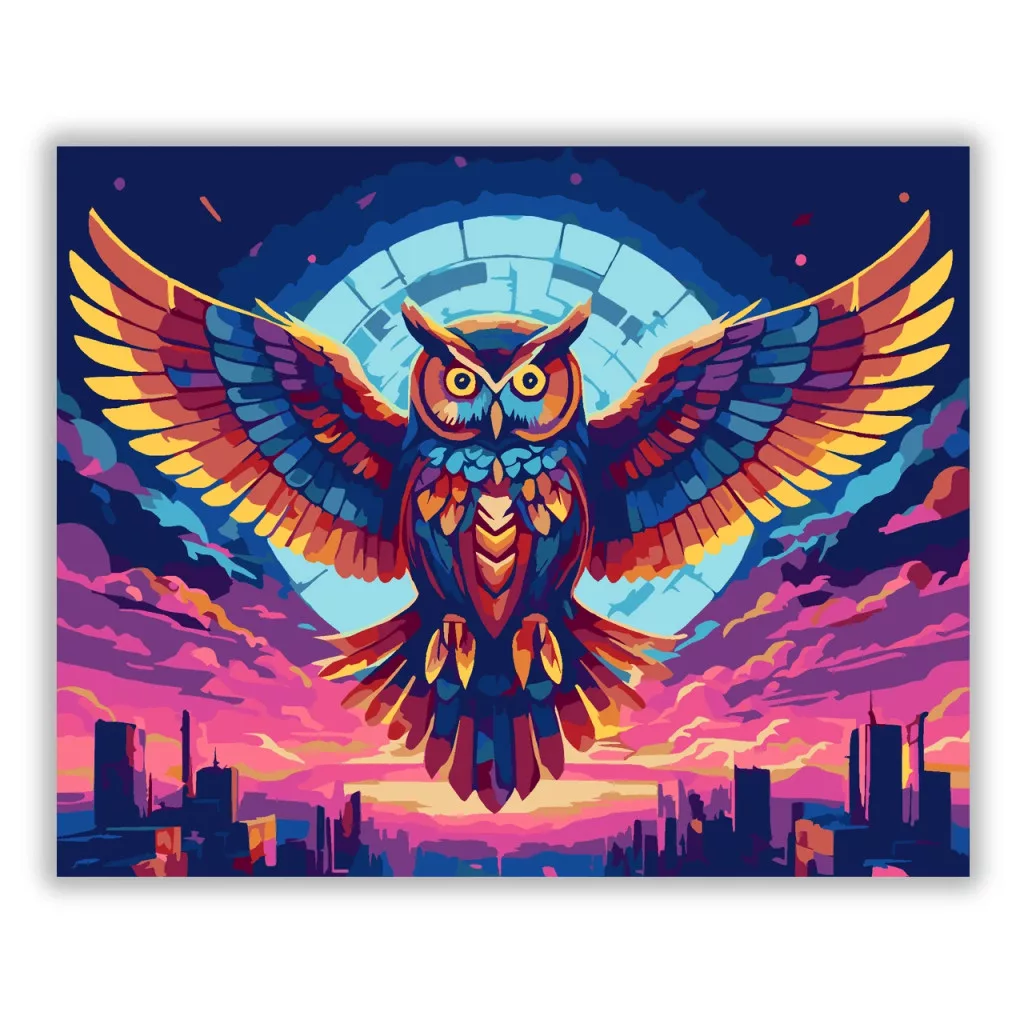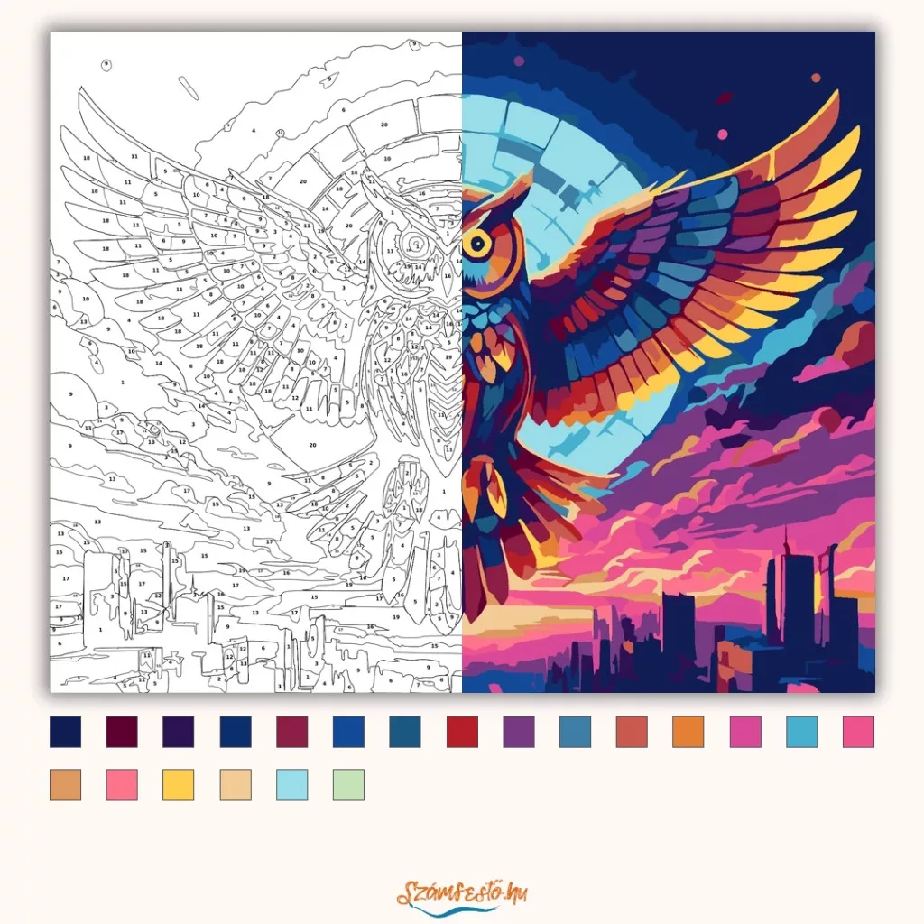 A képen egy színes bagoly látható, amely kitárt szárnyakkal repül egy neonfényű égbolt alatt. A ragyogó szemek és a színes tollazat erőteljes, futurisztikus hangulatot adnak. Alatta egy város sziluettje rajzolódik ki, a háttérben egy nagy, kör alakú fényudvarral. Ez a számfestő készlet tökéletes választás, ha egyedi dekorációval tennéd szebbé otthonodat, vagy ha különleges ajándékot keresel. A csomagban minden megtalálható, amire a festéshez szükséged van.