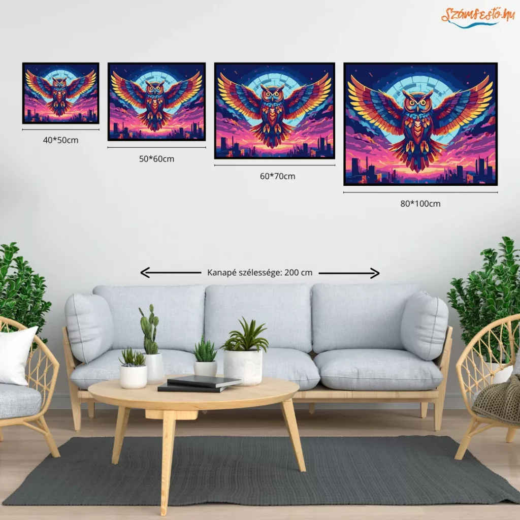 A képen egy színes bagoly látható, amely kitárt szárnyakkal repül egy neonfényű égbolt alatt. A ragyogó szemek és a színes tollazat erőteljes, futurisztikus hangulatot adnak. Alatta egy város sziluettje rajzolódik ki, a háttérben egy nagy, kör alakú fényudvarral. Díszítsd otthonodat saját kézzel készített műalkotással, vagy ajándékozd meg szeretteidet egy igazán különleges élménnyel! A számfestő készletben minden szükséges eszköz megtalálható a festmény elkészítéséhez.