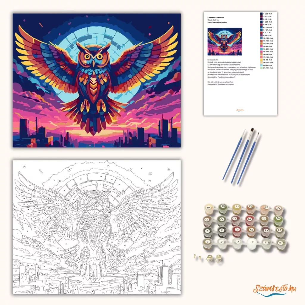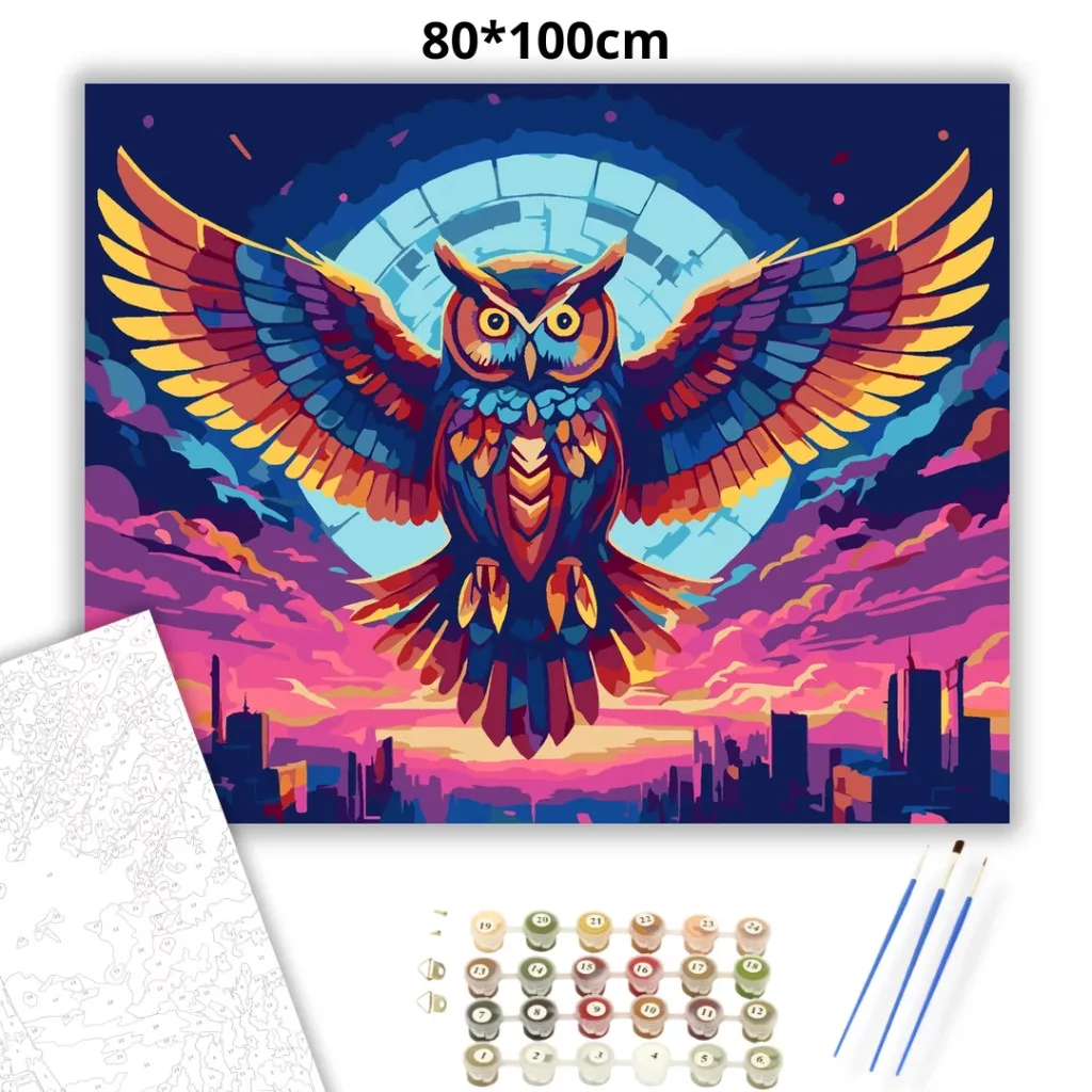 A képen egy színes bagoly látható, amely kitárt szárnyakkal repül egy neonfényű égbolt alatt. A ragyogó szemek és a színes tollazat erőteljes, futurisztikus hangulatot adnak. Alatta egy város sziluettje rajzolódik ki, a háttérben egy nagy, kör alakú fényudvarral. Legyen a lakásod dísze vagy egy kedves meglepetés valaki számára – ez a számfestő készlet tökéletes választás mindkettőre. A készletben mindent megtalálsz, amivel lépésről lépésre megalkotható ez a gyönyörű festmény.