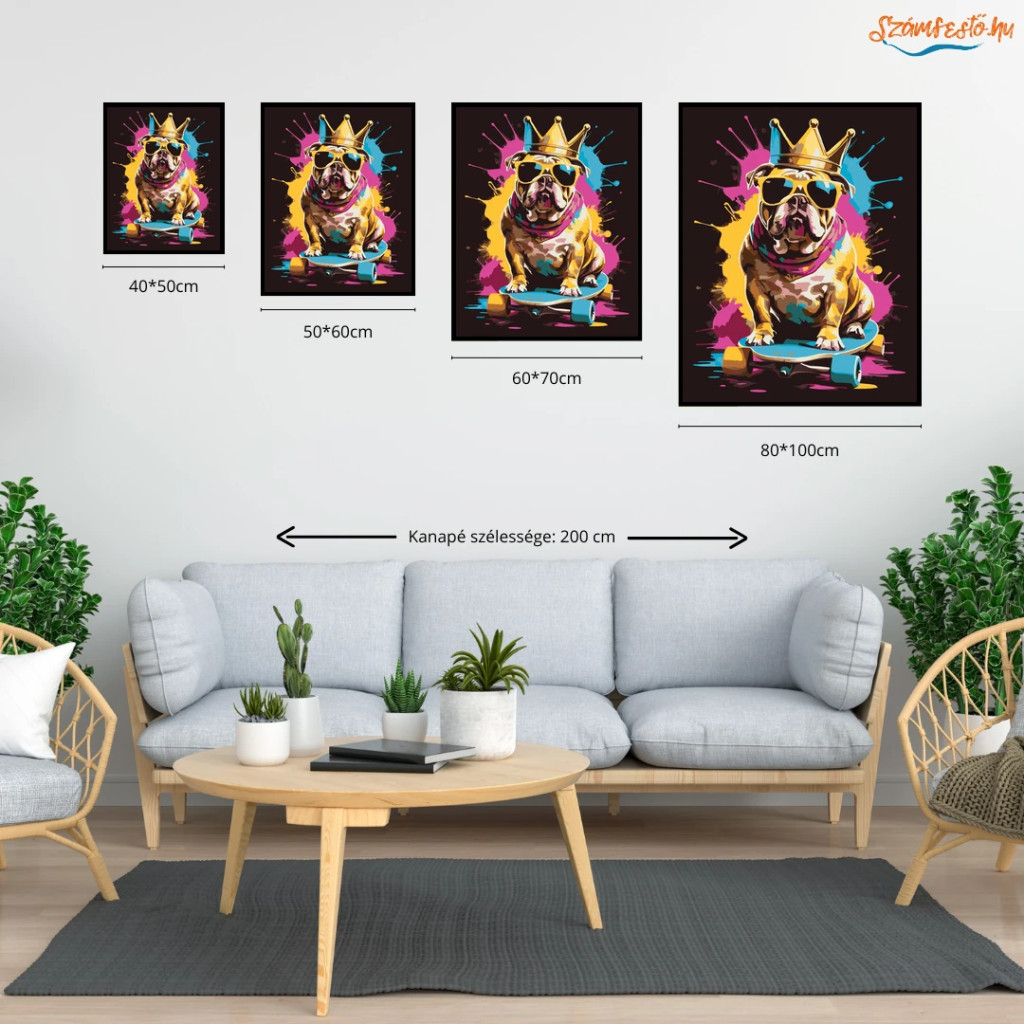 A képen egy bulldog látható gördeszkán, napszemüvegben és koronában. A sötét háttérből élénk festékfröccsenések ugranak elő, vagány, játékos hangulatot adva. A kutya nyakában egy kendő is látszik, ami még karakteresebbé teszi a jelenetet.