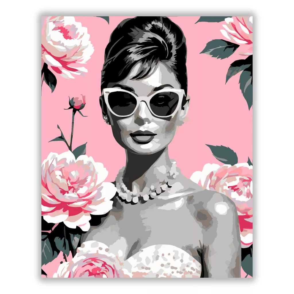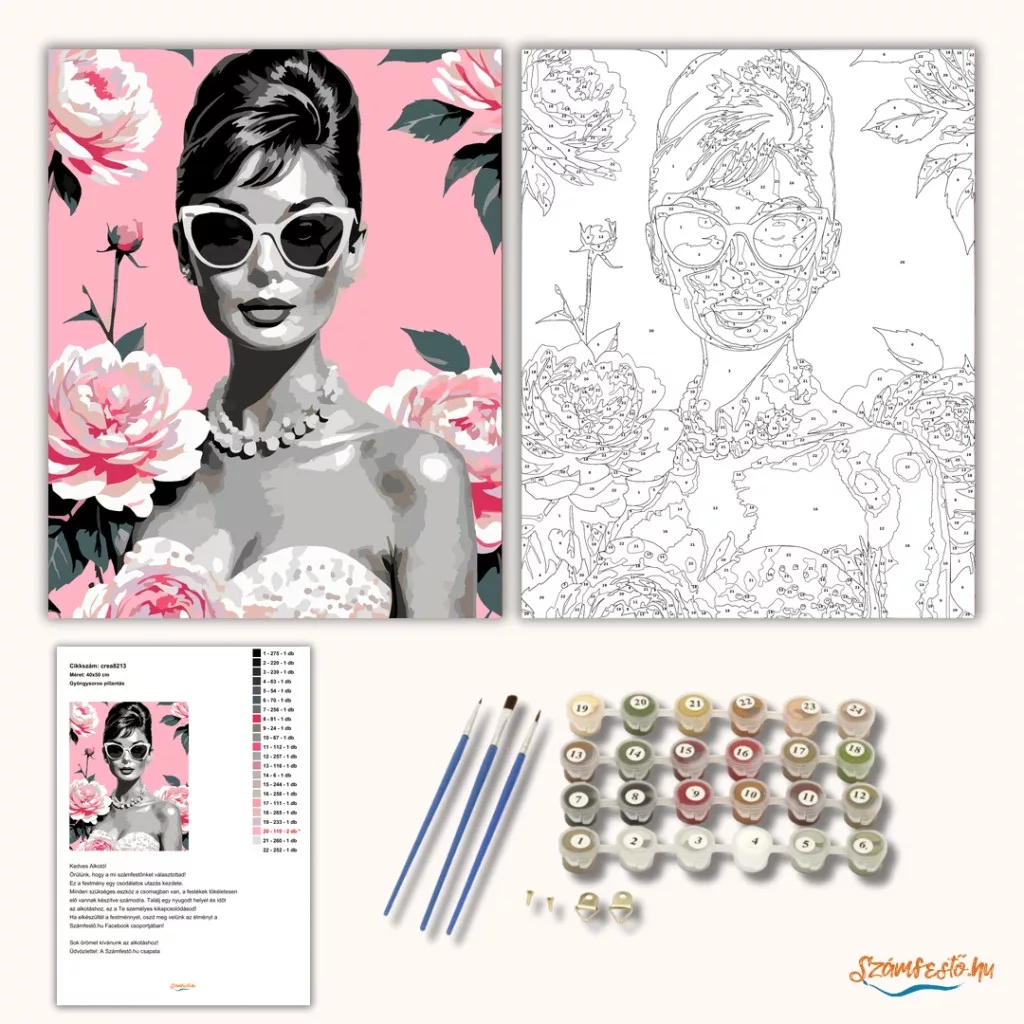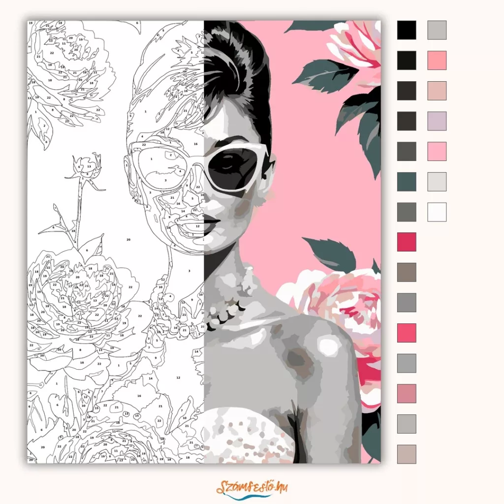 A képen egy napszemüveges női portré látható, gyöngy nyaklánccal és feltűzött frizurával. A háttérben és a kép szélein nagy, rózsaszín-fehér virágok és levelek veszik körül. Az összhatás elegáns és romantikus, puha rózsaszín háttérrel és szürke árnyalatú arccal.