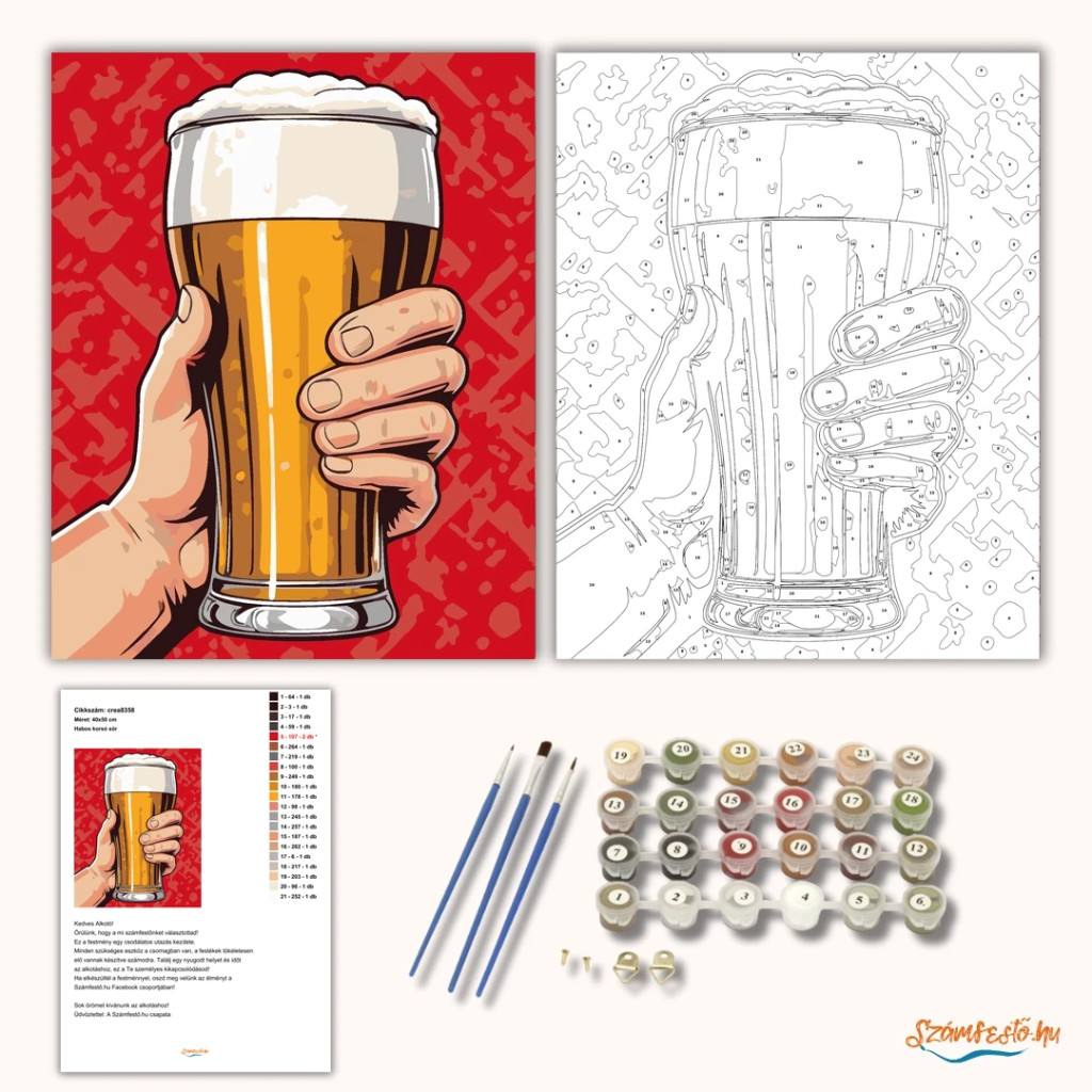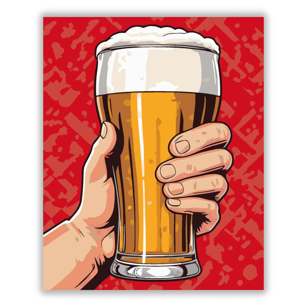 A képen egy kéz egy magas söröspoharat tart, benne aranyszínű sörrel és vastag habbal a tetején. A merész piros háttér lendületes, plakátszerű hangulatot ad. Vidám, kocsmás életérzést hoz a falra. Engedd szabadjára a kreativitásodat, és alkoss egy különleges műalkotást, amely otthonod dísze lehet de egyedi ajándékként is kiváló. A számfestő készletben minden szükséges eszközt megtalálsz a tökéletes végeredményhez.