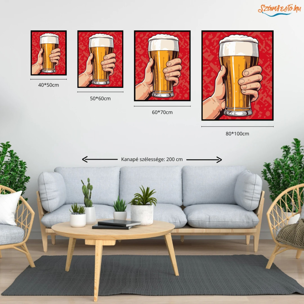 A képen egy kéz egy magas söröspoharat tart, benne aranyszínű sörrel és vastag habbal a tetején. A merész piros háttér lendületes, plakátszerű hangulatot ad. Vidám, kocsmás életérzést hoz a falra. Legyen a lakásod dísze vagy egy kedves meglepetés valaki számára – ez a számfestő készlet tökéletes választás mindkettőre. A készletben mindent megtalálsz, amivel lépésről lépésre megalkotható ez a gyönyörű festmény.