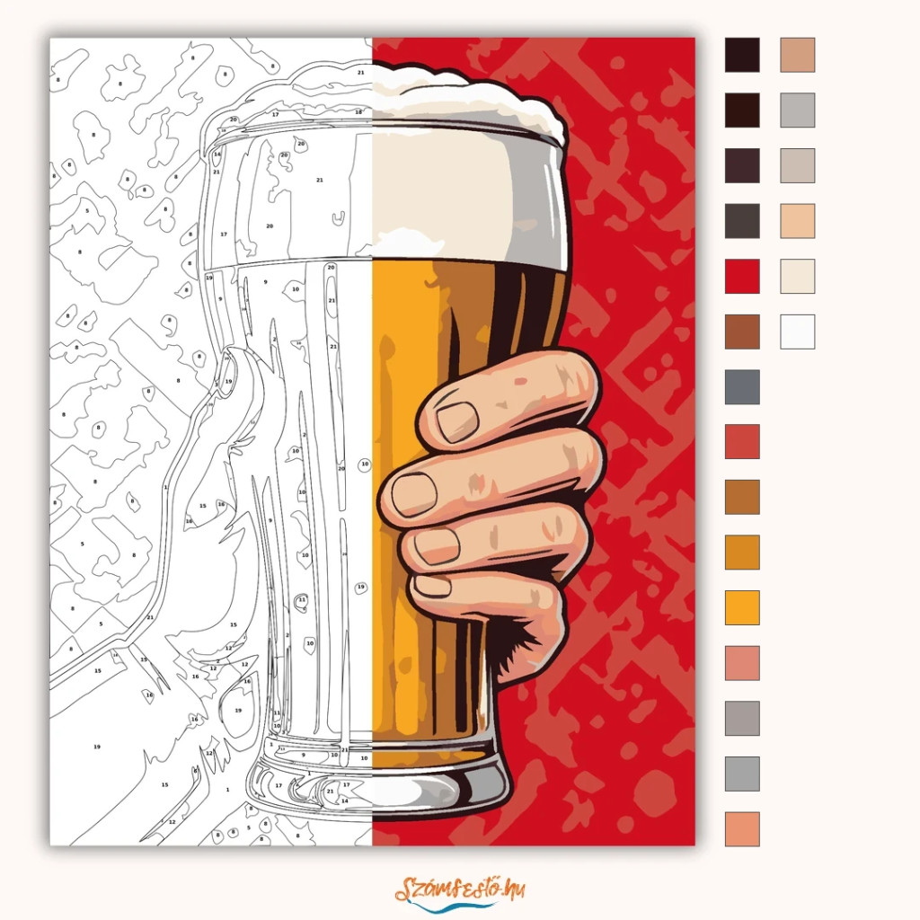 A képen egy kéz egy magas söröspoharat tart, benne aranyszínű sörrel és vastag habbal a tetején. A merész piros háttér lendületes, plakátszerű hangulatot ad. Vidám, kocsmás életérzést hoz a falra. Legyen a lakásod dísze vagy egy kedves meglepetés valaki számára – ez a számfestő készlet tökéletes választás mindkettőre. A készletben mindent megtalálsz, amivel lépésről lépésre megalkotható ez a gyönyörű festmény.
