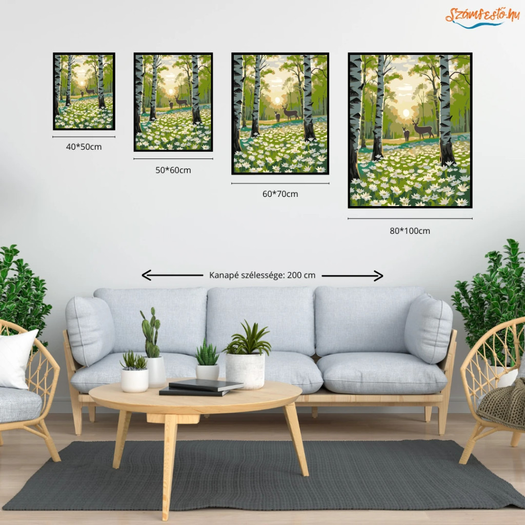 A képen tavaszi nyírfaerdő látható, ahol a felkelő nap fénye áttör az ágak között. Az előtérben fehér szellőrózsák borítják a talajt, a tisztáson pedig két szarvas áll csendben. A zöldek és a meleg, világos fény nyugodt, természetközeli hangulatot ad. Varázsolj egyedi hangulatot otthonodba ezzel a gyönyörű számfestő készlettel, amely tökéletes ajándék is lehet szeretteid számára. A csomag mindent tartalmaz, amire szükséged van ahhoz, hogy saját kezűleg alkoss egy lenyűgöző festményt.