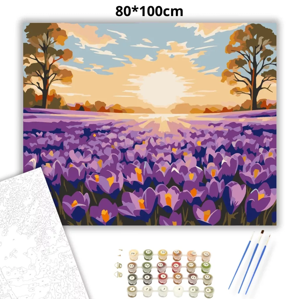 A képen napfelkelte látható egy tavaszi mező felett, amelyet lila krókuszok borítanak. A nap fénye a távolban ragyog, a felhők között pedig lágy, meleg árnyalatok jelennek meg. A látvány nyugodt, friss hangulatot áraszt, két oldalt fákkal keretezve. Varázsolj egyedi hangulatot otthonodba ezzel a gyönyörű számfestő készlettel, amely tökéletes ajándék is lehet szeretteid számára. A csomag mindent tartalmaz, amire szükséged van ahhoz, hogy saját kezűleg alkoss egy lenyűgöző festményt.