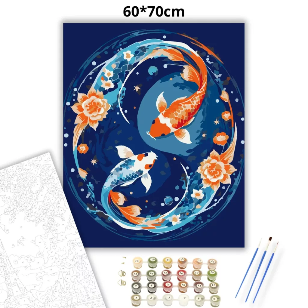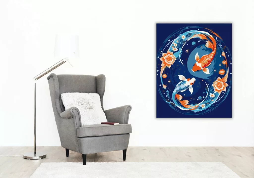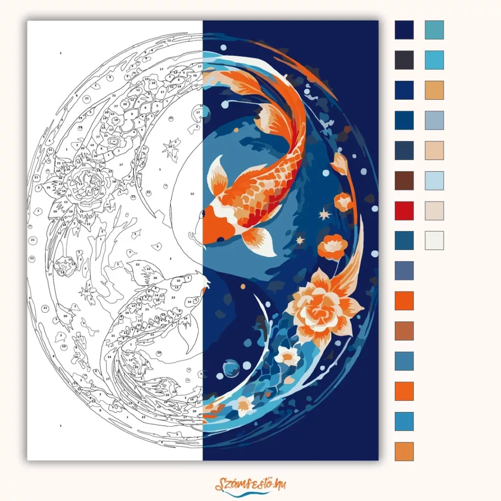 Két koi ponty köröz egymás körül, fénylő jin-jang spirált formázva a vízben. A sötétkék háttérben apró csillagok és vízcseppek ragyognak, a halak mellett virágok és szirmok sodródnak. Nyugodt, álomszerű kép, élénk narancs és hűvös kék árnyalatokkal. Díszítsd otthonodat saját kézzel készített műalkotással, vagy ajándékozd meg szeretteidet egy igazán különleges élménnyel! A számfestő készletben minden szükséges eszköz megtalálható a festmény elkészítéséhez.