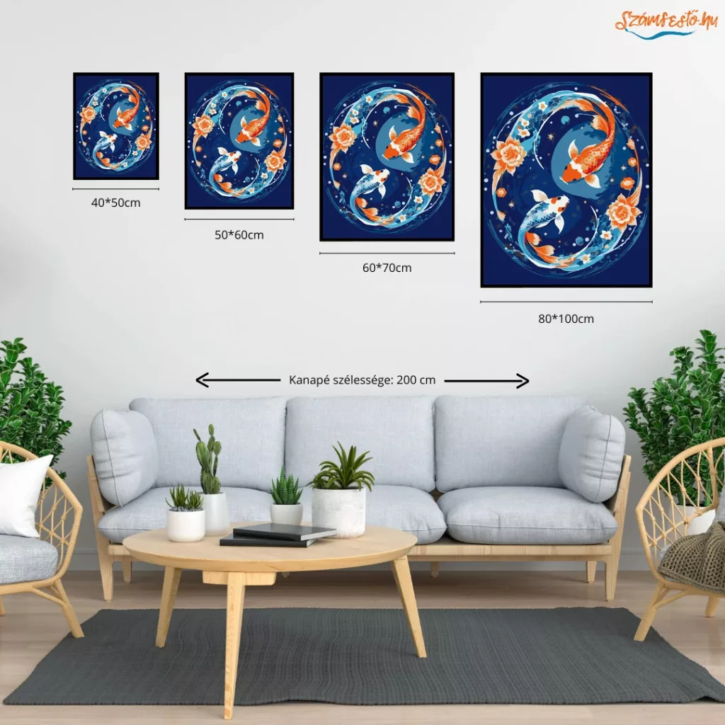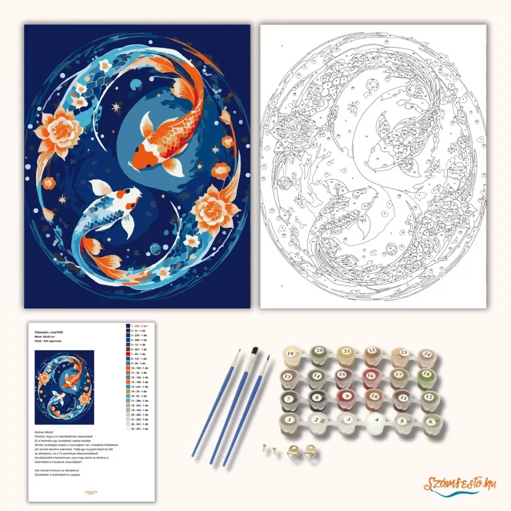 Két koi ponty köröz egymás körül, fénylő jin-jang spirált formázva a vízben. A sötétkék háttérben apró csillagok és vízcseppek ragyognak, a halak mellett virágok és szirmok sodródnak. Nyugodt, álomszerű kép, élénk narancs és hűvös kék árnyalatokkal. Díszítsd otthonodat saját kézzel készített műalkotással, vagy ajándékozd meg szeretteidet egy igazán különleges élménnyel! A számfestő készletben minden szükséges eszköz megtalálható a festmény elkészítéséhez.