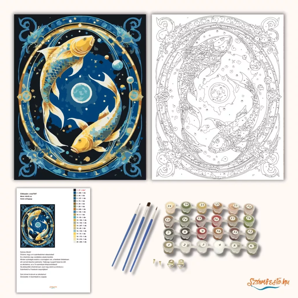 A képen két hal úszik ellentétes irányba, mintha egy csillagos, égi gyűrűben keringenének. Középen egy fénylő holdkorong látható, körülötte apró csillagok és bolygószerű gömbök. A mély kék háttér és az aranyos fények misztikus, nyugodt hangulatot adnak. Díszítsd otthonodat saját kézzel készített műalkotással, vagy ajándékozd meg szeretteidet egy igazán különleges élménnyel! A számfestő készletben minden szükséges eszköz megtalálható a festmény elkészítéséhez.