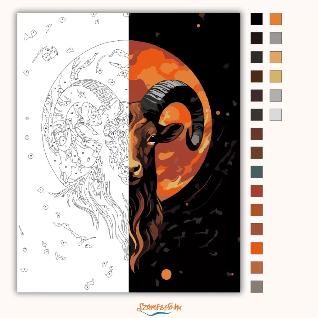 A képen egy kos feje látható nagy, ívelt szarvakkal, sötét égbolt előtt. Mögötte egy izzó, vöröses bolygó ragyog, körülötte apró csillagokkal és lebegő, törmelékszerű foltokkal. A kép erős, tüzes hangulatot áraszt, mély feketékkel és meleg narancs-vörös árnyalatokkal. Legyen a lakásod dísze vagy egy kedves meglepetés valaki számára – ez a számfestő készlet tökéletes választás mindkettőre. A készletben mindent megtalálsz, amivel lépésről lépésre megalkotható ez a gyönyörű festmény.