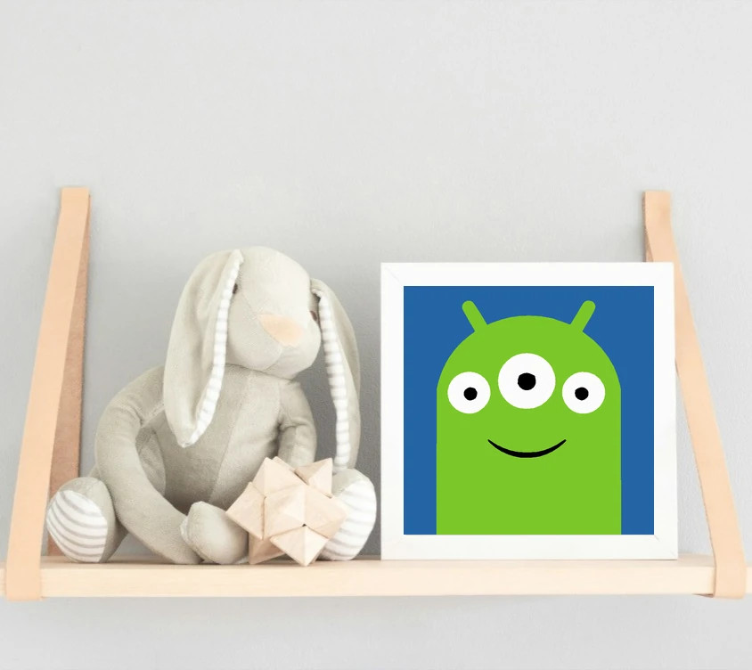 Ezen a képen egy barátságos, zöld kis szörnyecske mosolyog rád, három nagy szemmel. A kék háttér szépen kiemeli az élénk zöld testét. Egyszerű formái miatt könnyű és vidám festeni!