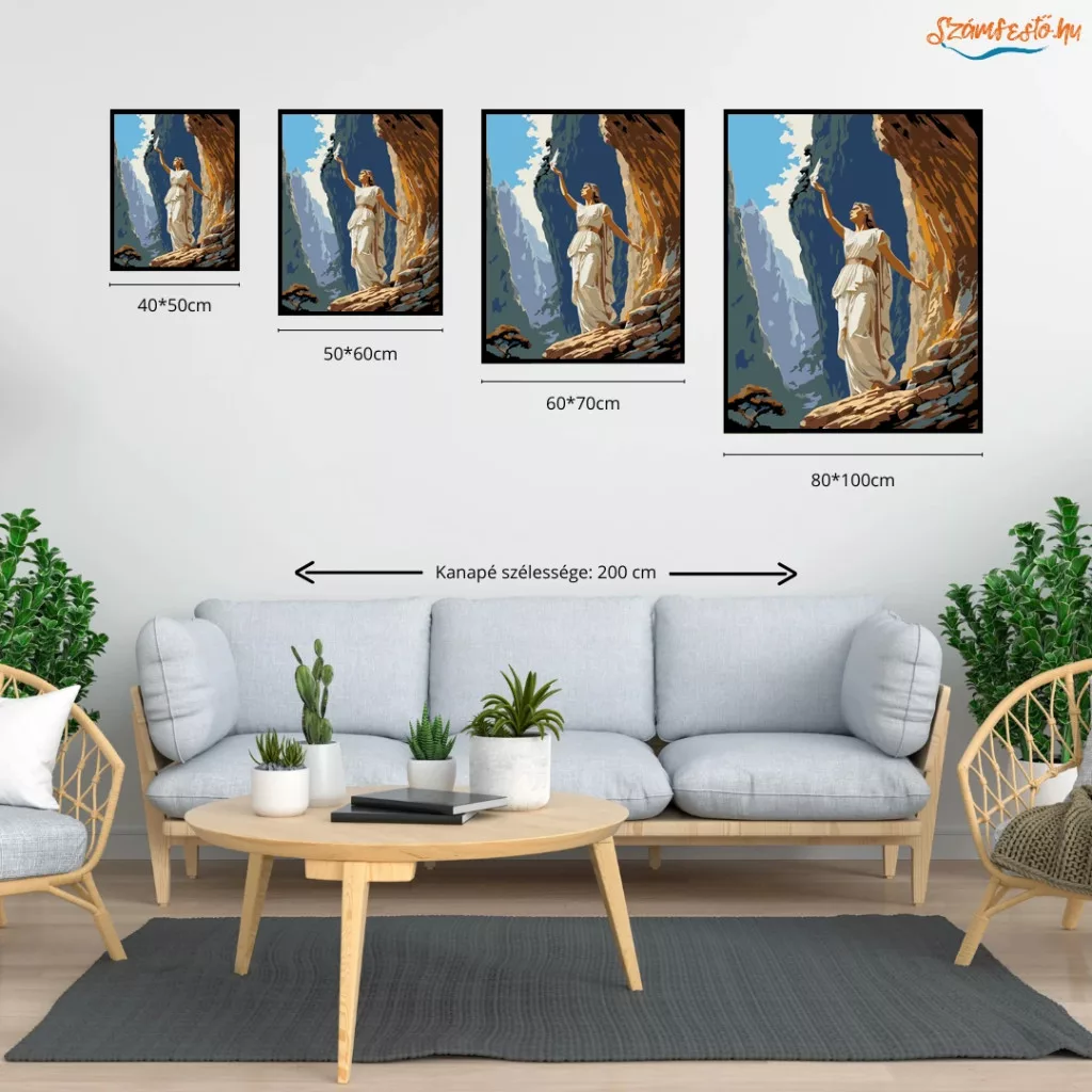 A képen egy római szibülla áll egy hegyi barlang bejáratánál, fehér ruhában, miközben egyik karját a magasba emeli. A sziklák között mély völgy tárul fel, felette sötétkék ég és világos felhők húzódnak. A jelenet titokzatos, drámai hangulatú, erős fény–árnyék hatásokkal. Díszítsd otthonodat saját kézzel készített műalkotással, vagy ajándékozd meg szeretteidet egy igazán különleges élménnyel! A számfestő készletben minden szükséges eszköz megtalálható a festmény elkészítéséhez.