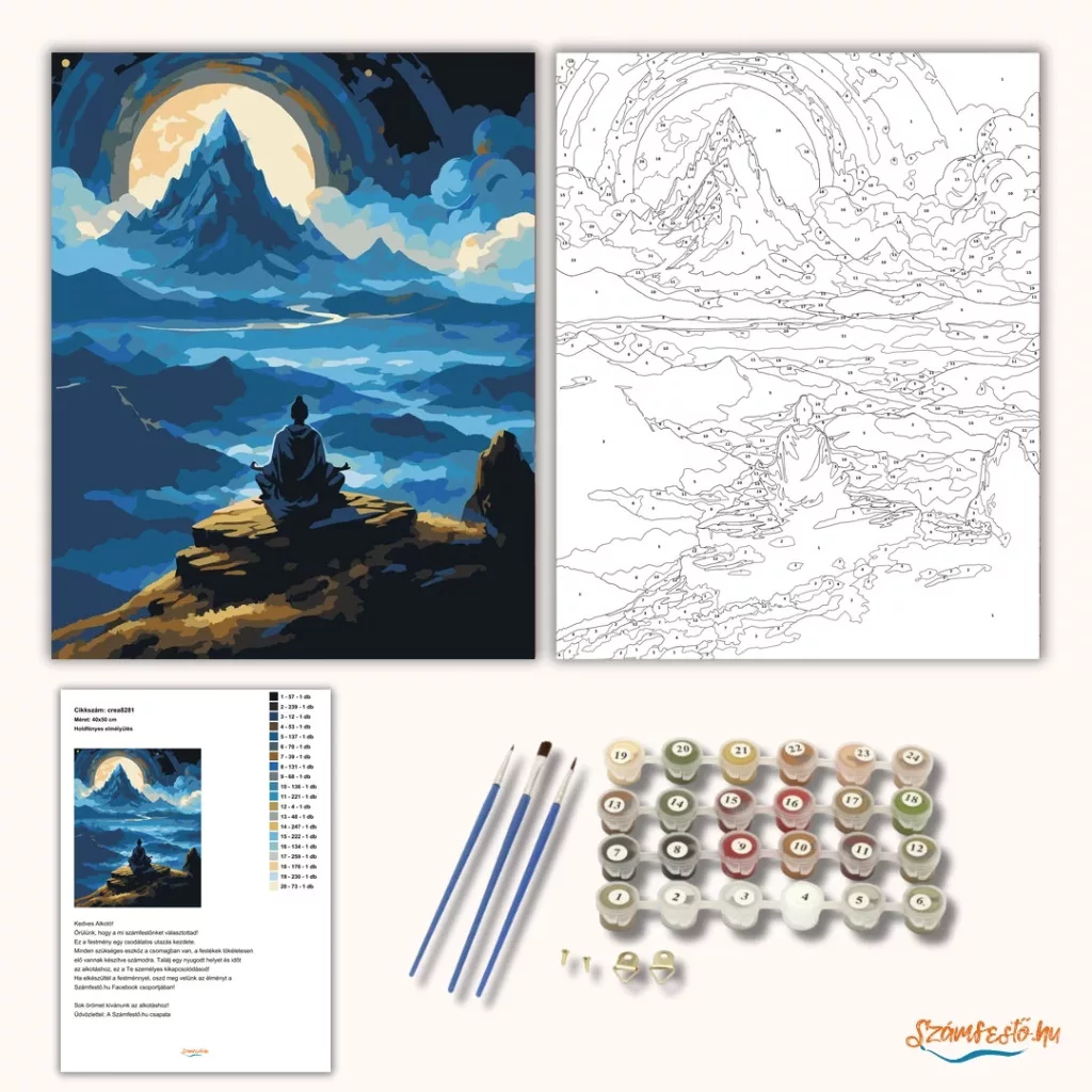 A képen egy magányos alak ül meditáló pózban egy sziklás hegytetőn. Előtte ködös völgyek és távoli hegycsúcsok láthatók. Fent örvénylő, csillagos éjszakai ég és hatalmas, ragyogó hold teremti meg a misztikus, nyugodt hangulatot. A kék és arany árnyalatok különleges, álomszerű látványt adnak. Varázsolj egyedi hangulatot otthonodba ezzel a gyönyörű számfestő készlettel, amely tökéletes ajándék is lehet szeretteid számára. A csomag mindent tartalmaz, amire szükséged van ahhoz, hogy saját kezűleg alkoss egy lenyűgöző festményt.