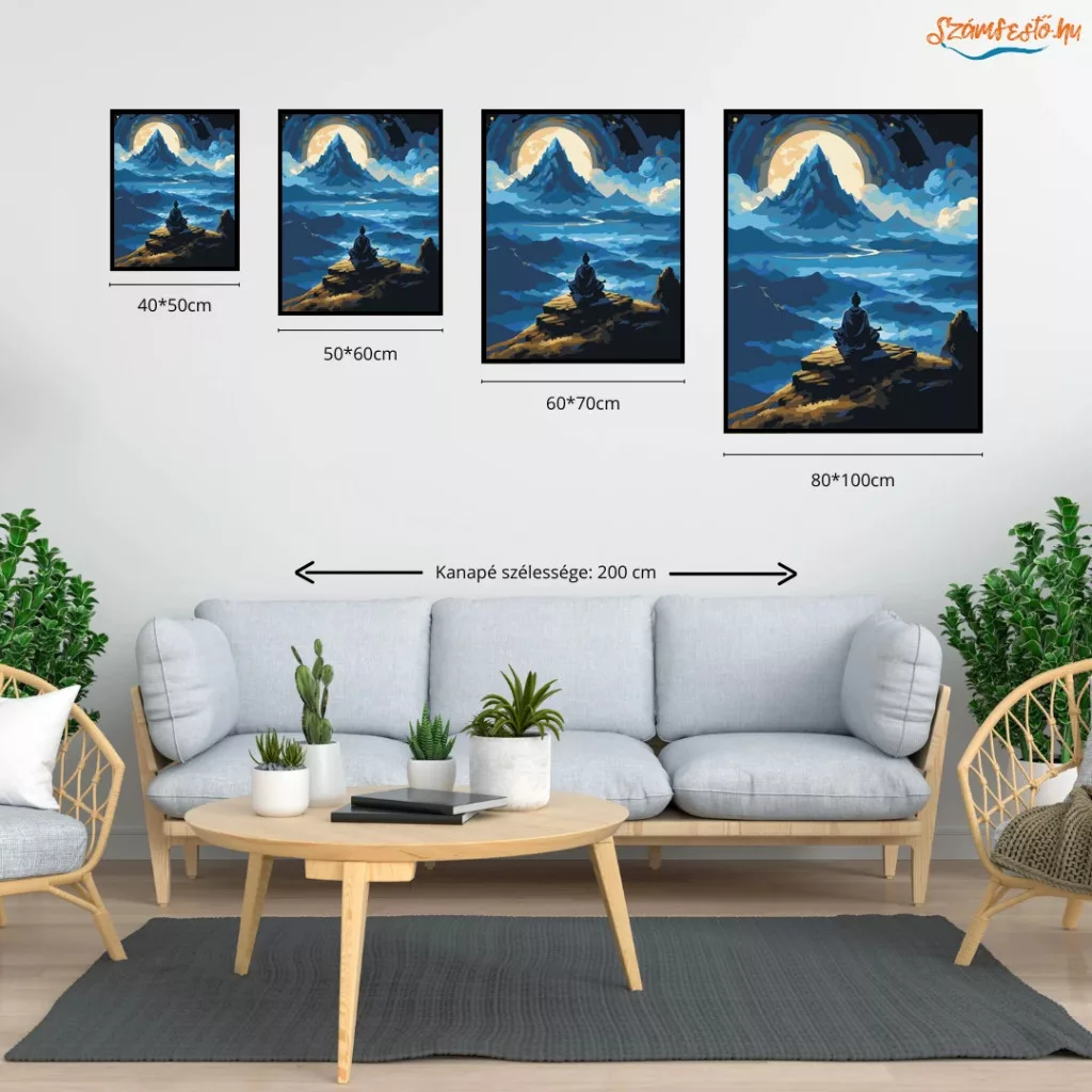 A képen egy magányos alak ül meditáló pózban egy sziklás hegytetőn. Előtte ködös völgyek és távoli hegycsúcsok láthatók. Fent örvénylő, csillagos éjszakai ég és hatalmas, ragyogó hold teremti meg a misztikus, nyugodt hangulatot. A kék és arany árnyalatok különleges, álomszerű látványt adnak. Engedd szabadjára a kreativitásodat, és alkoss egy különleges műalkotást, amely otthonod dísze lehet de egyedi ajándékként is kiváló. A számfestő készletben minden szükséges eszközt megtalálsz a tökéletes végeredményhez.