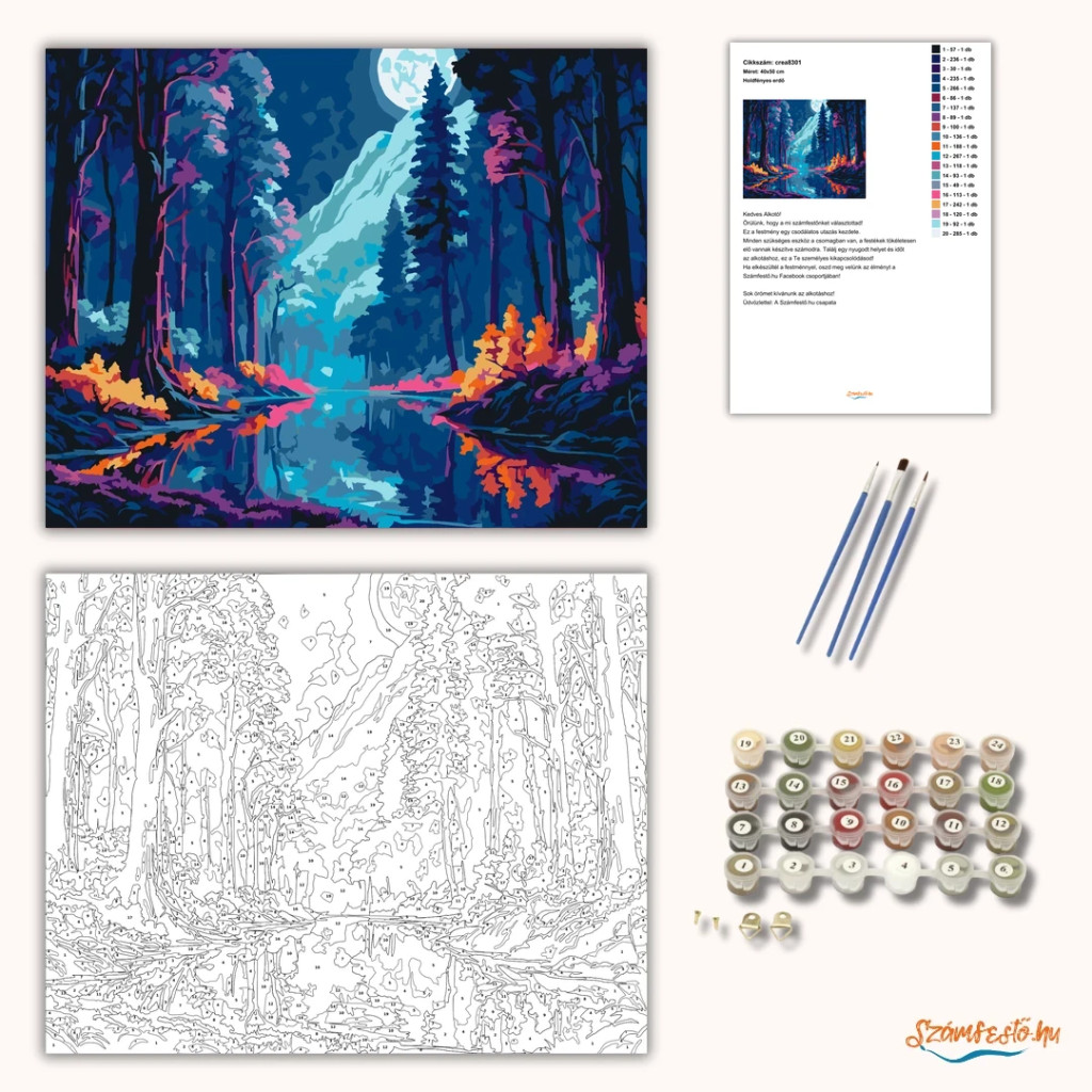 A képen egy éjszakai erdő látható, ahol a hold fénye a fák között egy ragyogó, kanyargó folyóra esik. A víz tükrében visszaverődnek a sötét fák és a világító partszéli bokrok. A látvány egyszerre nyugodt és különleges, erős neonfényű hangulattal. Legyen a lakásod dísze vagy egy kedves meglepetés valaki számára – ez a számfestő készlet tökéletes választás mindkettőre. A készletben mindent megtalálsz, amivel lépésről lépésre megalkotható ez a gyönyörű festmény.