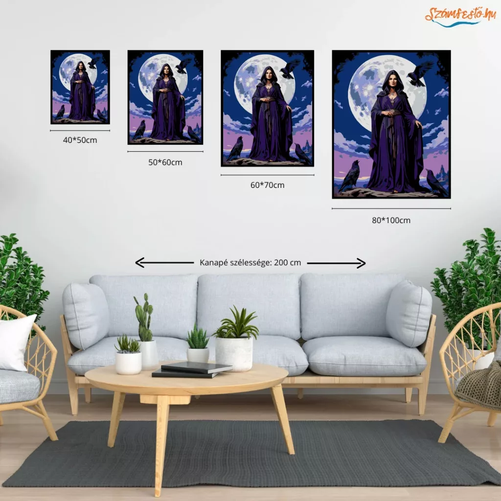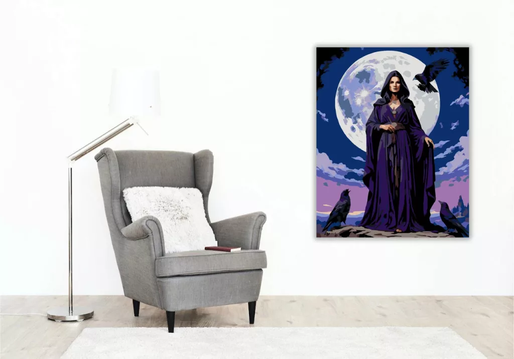 A képen egy sötétlila köpenyes boszorkány áll a telihold előtt, mellette és körülötte hollók figyelnek. Egyikük különösen hangsúlyos, mintha az ő látását helyettesítené, a holdfény felé fordulva. A hideg éjszakai fény és a madarak jelenléte misztikus, sejtelmes hangulatot teremt. Titokzatos jelenet, ahol az érzékelés és a mágia összefonódik. Varázsolj egyedi hangulatot otthonodba ezzel a gyönyörű számfestő készlettel, amely tökéletes ajándék is lehet szeretteid számára. A csomag mindent tartalmaz, amire szükséged van ahhoz, hogy saját kezűleg alkoss egy lenyűgöző festményt.
